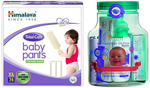 Himalaya Total Care Baby Pants Diapers Extra Large (12 - 17 kg) 74 CountAbout Himalaya Baby total care pants: Powered by natural antirash shield: Indian Aloe and Yashad Bhasma (Zinc Oxide) (that prevent risk of diaper rash) Soft easy-to-fit design offers care and comfort to your baby. silky soft inner layer for soft & sensitive skin Breathable fabric ensures proper air circulation and leakproof soft elastic edges prevent leakage. Superabsorbent polymer (SAP) layer: Rapidly absorbs multiple wettings and provides maximum protection from dampness. Wetness indicator: Turns green to show when baby wets the diaper. Keeps skin dry so that baby gets an undisturbed and restful sleep.Himalaya Herbals Babycare Gift Jar (Soap Shampoo Rash Cream and Powder)Himalaya Herbals Babycare Gift Jar (Soap Shampoo Rash Cream and Powder) A Perfect Gift for Your Loved Ones Himalaya babycare gift jar is the perfect gift for a newborn. This convenient gift jar for kids comprises a Himalaya gentle baby shampoo 40 ml baby soap 75 gm baby powder 100 gm and a diaper rash cream 20 gm. Clinically proven for their mildness these baby care products are formulated to protect and nourish delicate baby skin and prevent rashes and allergies. A cute looking transparent jar that accommodates all the products is an added attraction and it is a great and affordable gift. Suitable for newborns and kids alike this herbal's babycare gift pack is indeed a great option when your in a hurry and there is not much time to scout around for a special gift. Four-in-One Goodness of Natural Care The Himalaya baby gift pack with its four essential hand picked products brings you the goodness of four great products in one pack. Its Gentle baby shampoo is enriched with hibiscus chickpea and other natural extracts that protect and nourish your baby's delicate scalp and hair. The Gentle baby soap is blessed with the essence of almond and olive oil that cleanses moisturises and softens your baby's skin tone. A mild and hypoallergenic baby powder sprinkled with the soothing properties of khus-khus keeps your infant's skin cool and fresh. Besides these its Aloe Vera and almond oil based diaper rash cream ensures your baby's skin stays soft and smooth without any rashes or diaper woes. Buy this baby gift pack online and spread health and joy. Brand: Himalaya Ideal for: Dry and Scaly skin inflammation itching Age: Newborn and up Contents: Gentle baby shampoo 40 ml Gentle baby Soap 75 gm baby powder 100 gm and a diaper rash cream 20 gm Hypoallergenic Paediatrician recommended Attractive jar packaging