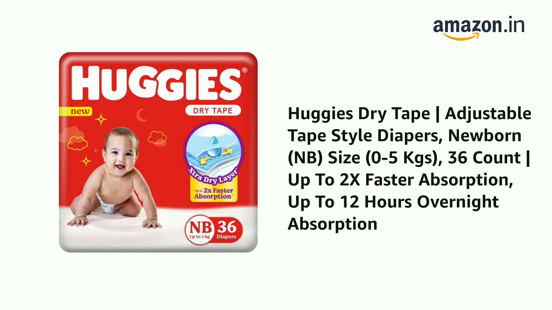 Huggies Complete ComfortTM Dry Tape provides 5 benefits in 1 diaper. Its Adjustable waistband ensures a snug fit and fights red marks. Made from air friendly material our diapers help your baby's skin to breathe. Up to 12 Hours of Overnight Absorption allows you and your baby to have a comfortable sleep. Double leak guard provides extra padding to prevent thigh leakage and has cotton like softness for your baby's delicate skin. Our Tape style diapers are available in all sizes from Newborn-Small Medium and Large sizes.