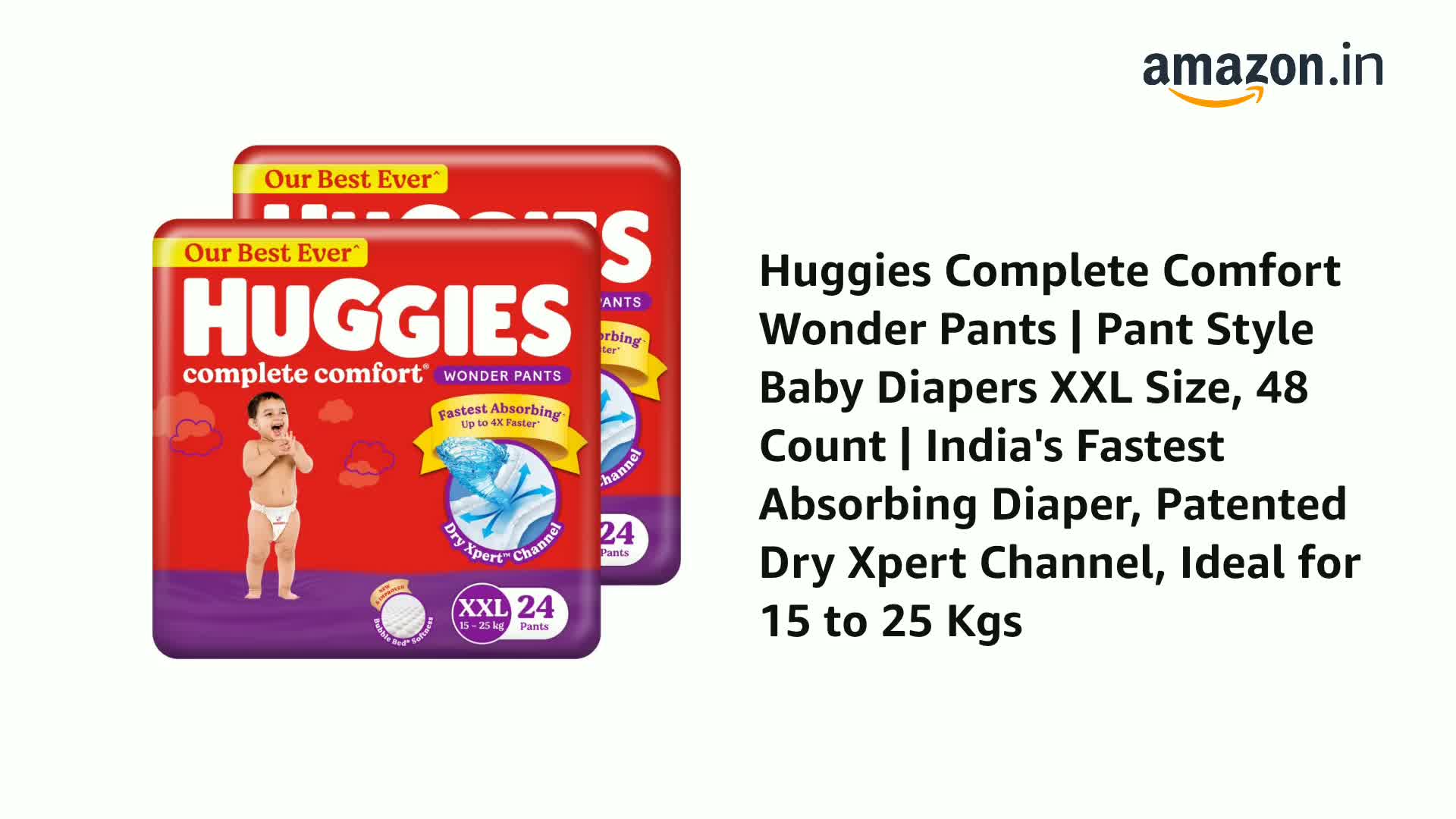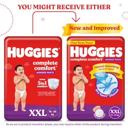 Huggies Complete ComfortTM Wonder Pants provides 5 benefits in 1 diaper. With India's 1st Pants with Bubble Bed technology Huggies provides a soft inner bubble layer that wraps your baby in softness. Made from air friendly material our diaper pants help your baby's skin to breathe. Up to 12 Hours of Overnight Absorption allows you and your baby to have a comfortable sleep. Triple leak guard provides extra padding to fight leakage and Comfy fit waistband ensures a snug fit for your baby. Our Pant style diapers are available in all sizes from Newborn/XS S M L XL and XXL sizes.