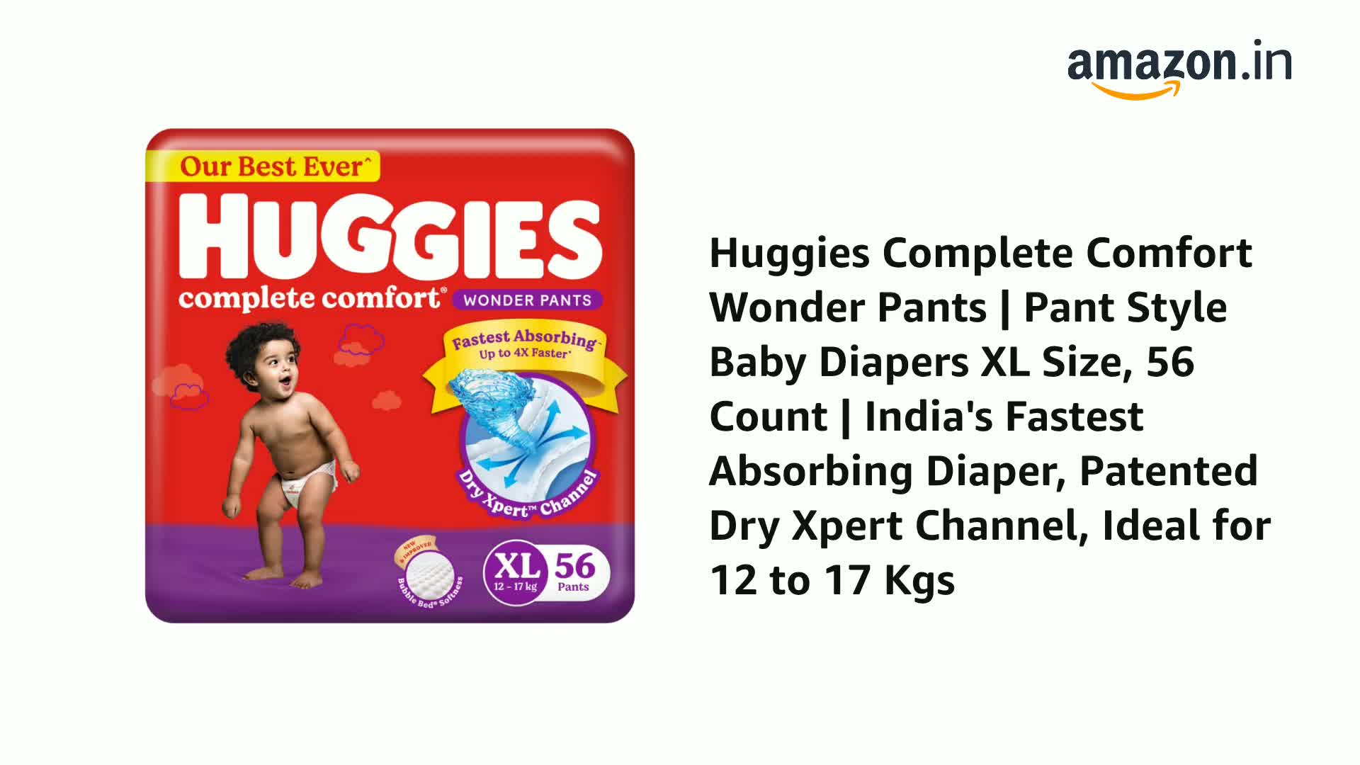 Huggies Complete Comfort Wonder Pants | Pant Style Baby Diapers XL Size, 56 Count | India's Fastest Absorbing Diaper, Patented Dry Xpert Channel, Ideal for 12 to 17 Kgs