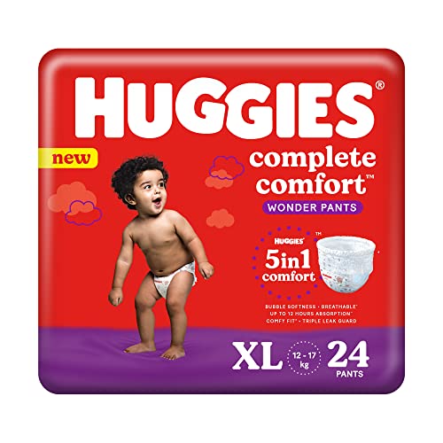 Huggies Complete ComfortTM Wonder Pants provides 5 benefits in 1 diaper. With India's 1st Pants with Bubble Bed technology Huggies provides a soft inner bubble layer that wraps your baby in softness. Made from air friendly material our diaper pants help your baby's skin to breathe. Up to 12 Hours of Overnight Absorption allows you and your baby to have a comfortable sleep. Triple leak guard provides extra padding to fight leakage and Comfy fit waistband ensures a snug fit for your baby. Our Pant style diapers are available in all sizes from Newborn/XS S M L XL and XXL sizes.