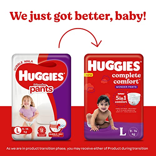 Huggies Complete ComfortTM Wonder Pants provides 5 benefits in 1 diaper. With India's 1st Pants with Bubble Bed technology Huggies provides a soft inner bubble layer that wraps your baby in softness. Made from air friendly material our diaper pants help your baby's skin to breathe. Up to 12 Hours of Overnight Absorption allows you and your baby to have a comfortable sleep. Triple leak guard provides extra padding to fight leakage and Comfy fit waistband ensures a snug fit for your baby. Our Pant style diapers are available in all sizes from Newborn/XS S M L XL and XXL sizes.
