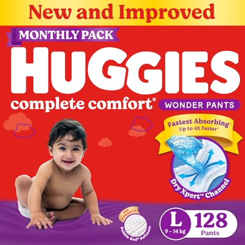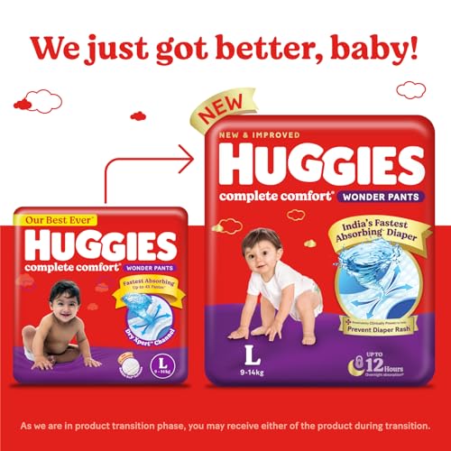 Introducing the New and Improved Huggies Complete Comfort Wonder Pants - India's Fastest Absorbing Diaper. Designed to provide maximum comfort and absorbency for your little one these are our best ever diaper pants. With our patented Dry Xpert technology that spreads urine evenly across the diaper - these diaper pants are now up to 4x Faster in absorbing urine ensuring your baby stays dry and comfortable. But that's not all! Our diaper pants also feature India's 1st Bubble Bed technology that provides a soft inner bubble layer to wrap your baby in ultimate softness. Made from air-friendly breathable material these pants help your baby's skin breathe keeping them comfortable throughout the day protecting them from rashes. And with up to 12 hours of overnight absorption you can both have a peaceful night's sleep. We understand how important it is to keep your baby dry at all times which is why our diaper pants come with double leak guard protection. This extra padding helps prevent thigh leakage ensuring there are no messes to deal with. Choose from a range of sizes of our Pant Style Diapers - including diapers New born /XS size diapers S size (small) diapers M size (medium) diapers L size (large) diapers XL size (extra large) diapers XXL size (double extra large) and diapers XXXL size (triple extra large) - making it suitable for babies of all ages and sizes. Trust Huggies Complete Comfort Wonder Pants for complete care and protection for your little one. Add the new and improved Huggies Complete Comfort Wonder Pants to your shopping cart today! Available on Amazon.