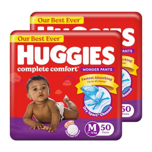 Huggies Complete Comfort Wonder Pants | Pant Style Baby Diapers M Size, 100 Count | India's Fastest Absorbing Diaper, Patented Dry Xpert Channel, Ideal for 7 to 12 Kgs