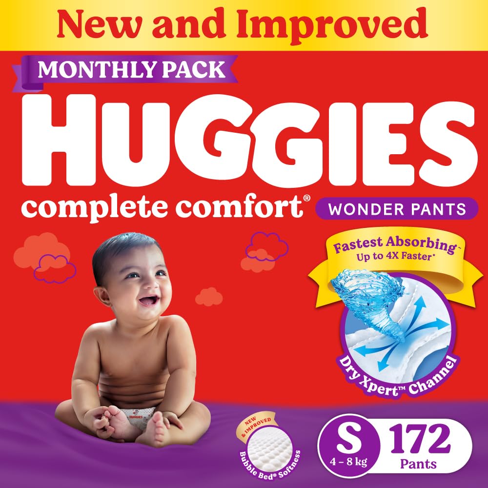 Introducing the New and Improved Huggies Complete Comfort Wonder Pants - India's Fastest Absorbing Diaper. Designed to provide maximum comfort and absorbency for your little one these are our best ever diaper pants. With our patented Dry Xpert technology that spreads urine evenly across the diaper - these diaper pants are now up to 4x Faster in absorbing urine ensuring your baby stays dry and comfortable. But that's not all! Our diaper pants also feature India's 1st Bubble Bed technology that provides a soft inner bubble layer to wrap your baby in ultimate softness. Made from air-friendly breathable material these pants help your baby's skin breathe keeping them comfortable throughout the day protecting them from rashes. And with up to 12 hours of overnight absorption you can both have a peaceful night's sleep. We understand how important it is to keep your baby dry at all times which is why our diaper pants come with double leak guard protection. This extra padding helps prevent thigh leakage ensuring there are no messes to deal with. Choose from a range of sizes of our Pant Style Diapers - including diapers New born /XS size diapers S size (small) diapers M size (medium) diapers L size (large) diapers XL size (extra large) diapers XXL size (double extra large) and diapers XXXL size (triple extra large) - making it suitable for babies of all ages and sizes. Trust Huggies Complete Comfort Wonder Pants for complete care and protection for your little one. Add the new and improved Huggies Complete Comfort Wonder Pants to your shopping cart today! Available on Amazon.