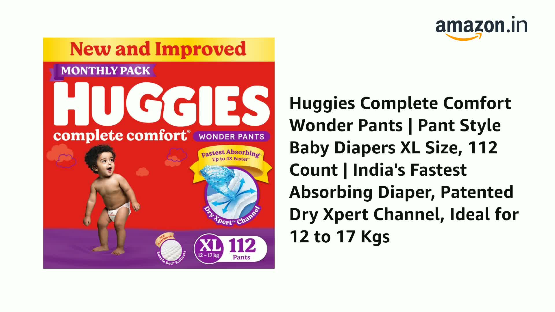 Introducing the New and Improved Huggies Complete Comfort Wonder Pants - India's Fastest Absorbing Diaper. Designed to provide maximum comfort and absorbency for your little one these are our best ever diaper pants. With our patented Dry Xpert technology that spreads urine evenly across the diaper - these diaper pants are now up to 4x Faster in absorbing urine ensuring your baby stays dry and comfortable. But that's not all! Our diaper pants also feature India's 1st Bubble Bed technology that provides a soft inner bubble layer to wrap your baby in ultimate softness. Made from air-friendly breathable material these pants help your baby's skin breathe keeping them comfortable throughout the day protecting them from rashes. And with up to 12 hours of overnight absorption you can both have a peaceful night's sleep. We understand how important it is to keep your baby dry at all times which is why our diaper pants come with double leak guard protection. This extra padding helps prevent thigh leakage ensuring there are no messes to deal with. Choose from a range of sizes of our Pant Style Diapers - including diapers New born /XS size diapers S size (small) diapers M size (medium) diapers L size (large) diapers XL size (extra large) diapers XXL size (double extra large) and diapers XXXL size (triple extra large) - making it suitable for babies of all ages and sizes. Trust Huggies Complete Comfort Wonder Pants for complete care and protection for your little one. Add the new and improved Huggies Complete Comfort Wonder Pants to your shopping cart today! Available on Amazon.