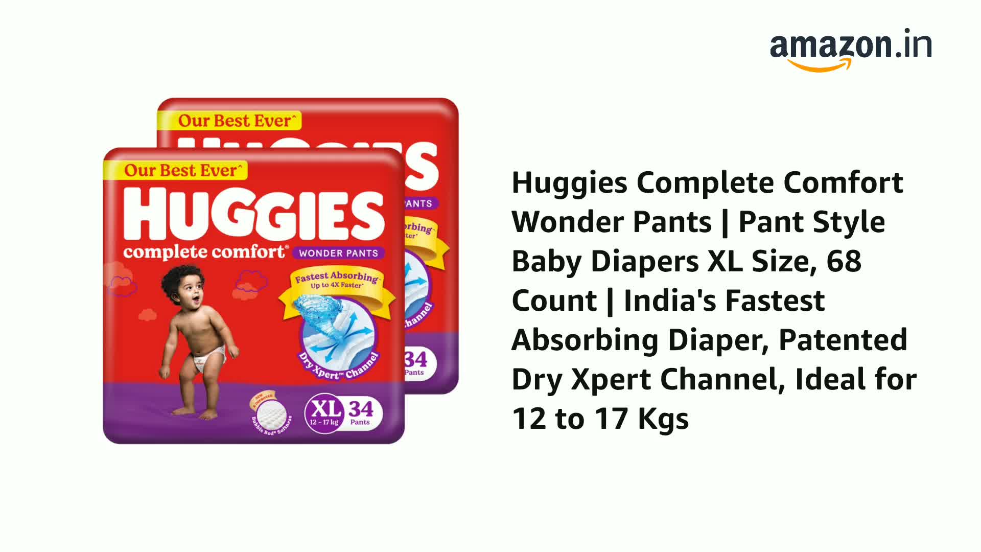Introducing the New and Improved Huggies Complete Comfort Wonder Pants - India's Fastest Absorbing Diaper. Designed to provide maximum comfort and absorbency for your little one these are our best ever diaper pants. With our patented Dry Xpert technology that spreads urine evenly across the diaper - these diaper pants are now up to 4x Faster in absorbing urine ensuring your baby stays dry and comfortable. But that's not all! Our diaper pants also feature India's 1st Bubble Bed technology that provides a soft inner bubble layer to wrap your baby in ultimate softness. Made from air-friendly breathable material these pants help your baby's skin breathe keeping them comfortable throughout the day protecting them from rashes. And with up to 12 hours of overnight absorption you can both have a peaceful night's sleep. We understand how important it is to keep your baby dry at all times which is why our diaper pants come with double leak guard protection. This extra padding helps prevent thigh leakage ensuring there are no messes to deal with. Choose from a range of sizes of our Pant Style Diapers - including diapers New born /XS size diapers S size (small) diapers M size (medium) diapers L size (large) diapers XL size (extra large) diapers XXL size (double extra large) and diapers XXXL size (triple extra large) - making it suitable for babies of all ages and sizes. Trust Huggies Complete Comfort Wonder Pants for complete care and protection for your little one. Add the new and improved Huggies Complete Comfort Wonder Pants to your shopping cart today! Available on Amazon.