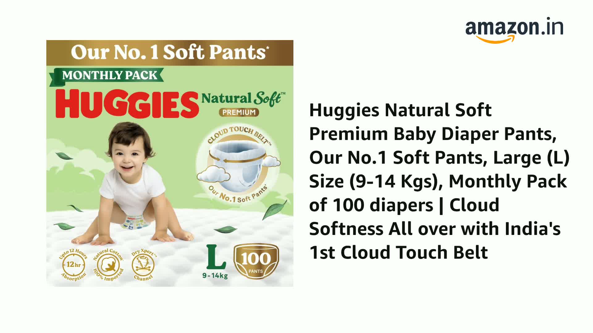 • Our No.1 soft Pants: New & Premium Huggies Natural Soft comes with India's 1st Cloud Touch BeltTM with cloud softness all over to help prevent red marks; Large (L) Size (9-14 Kgs) Monthly Pack of 50x2 diapers