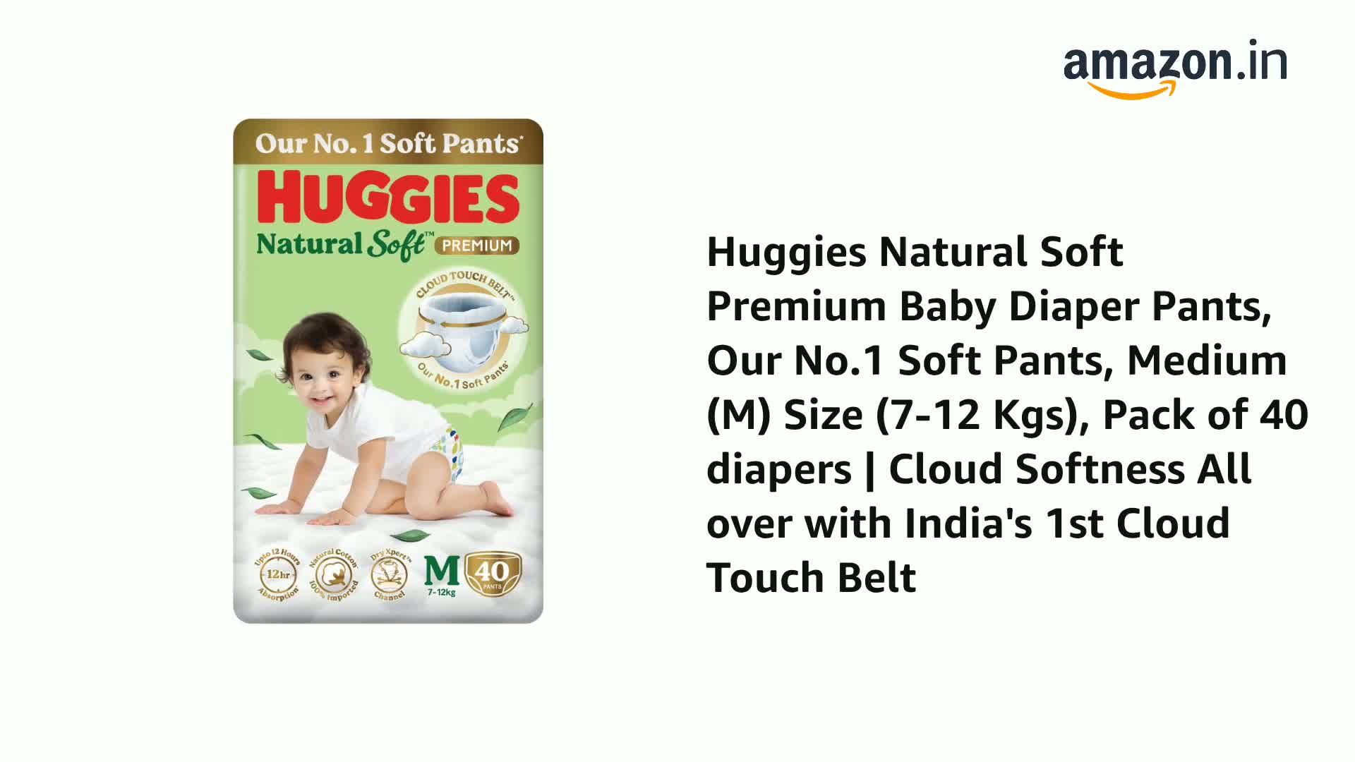 • Our No.1 soft Pants: New & Premium Huggies Natural Soft comes with India's 1st Cloud Touch BeltTM with cloud softness all over to help prevent red marks; Medium (M) Size (7-12 Kgs) Pack of 40 diapers