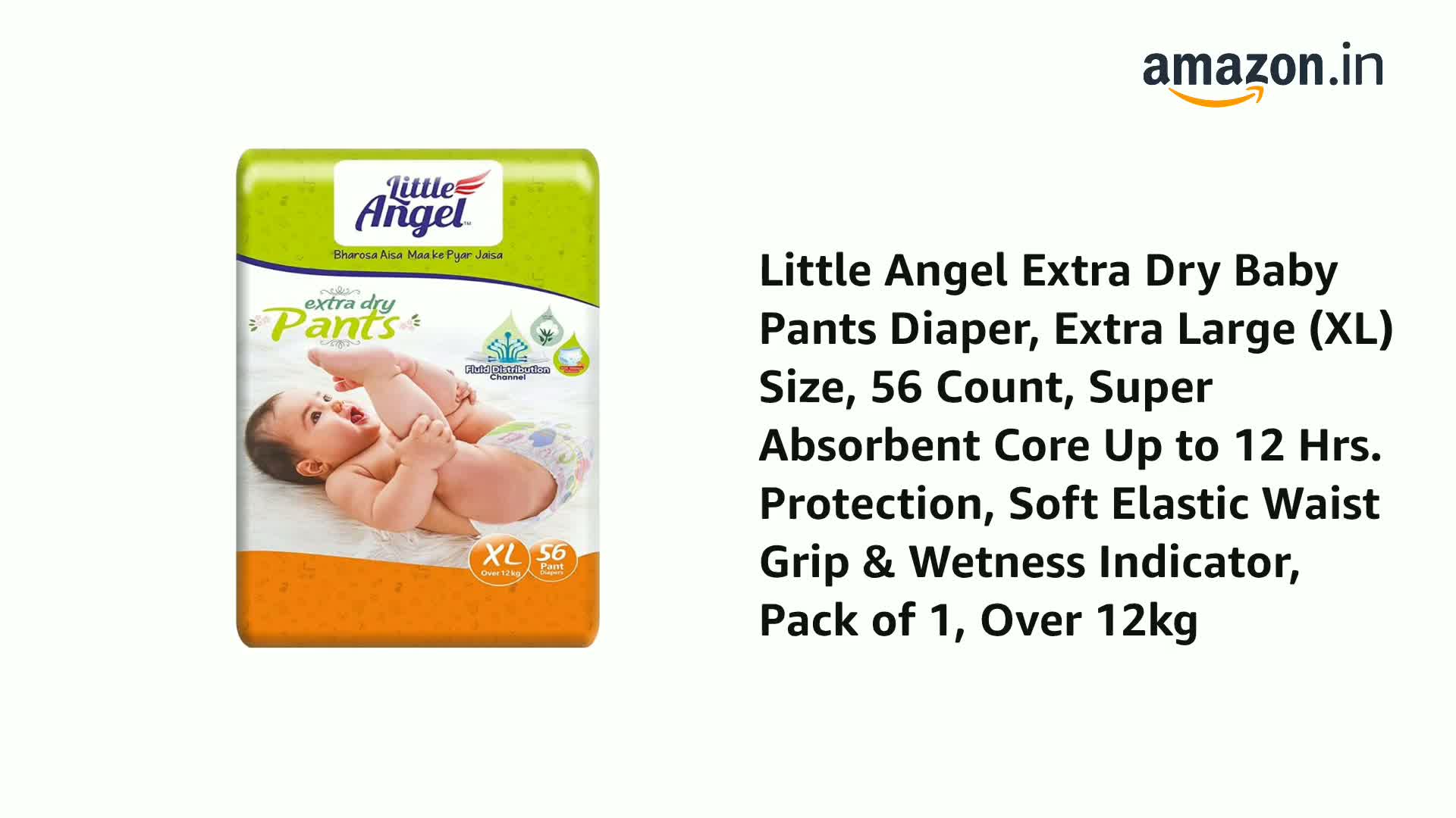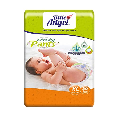 Little Angel Extra Dry Baby Pants Diaper, Extra Large (XL) Size, 56 Count, Super Absorbent Core Up to 12 Hrs. Protection, Soft Elastic Waist Grip & Wetness Indicator, Pack of 1, Over 12kg