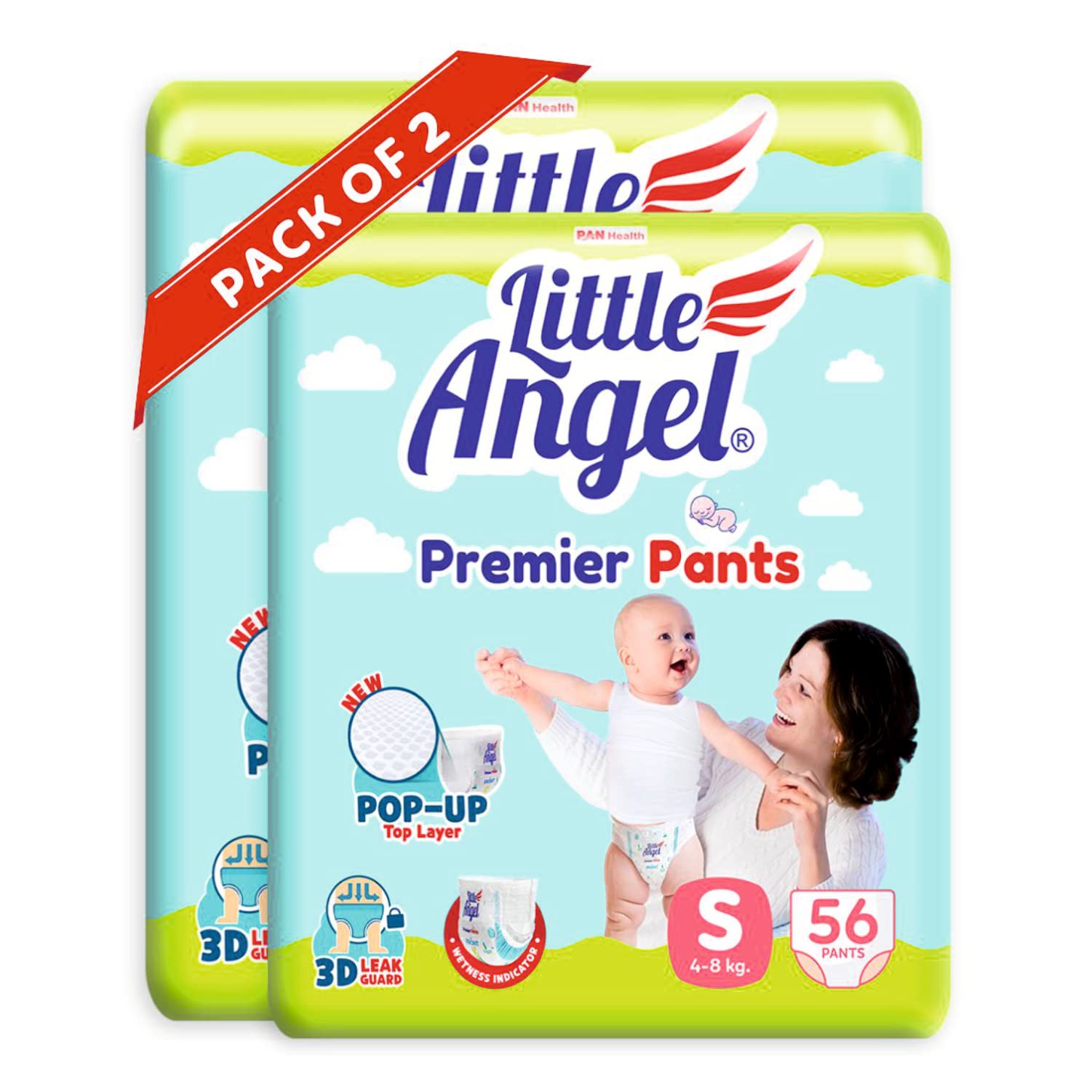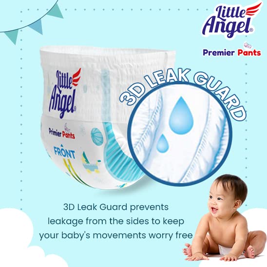 HomeBabyDiaperingBaby DiapersLittle Angel Premier Pants Baby Diapers, Small (S) Size, 112 Count, Combo Pack of 2, 56 Count/pack with Wetness Indicator, 4-8 Kg