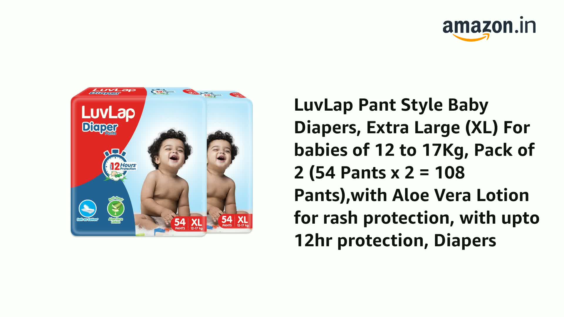 LuvLap Pant Style Baby Diapers, Extra Large (XL) For babies of 12 to 17Kg, Pack of 2 (54 Pants x 2 = 108 Pants),with Aloe Vera Lotion for rash protection, with upto 12hr protection, Diapers