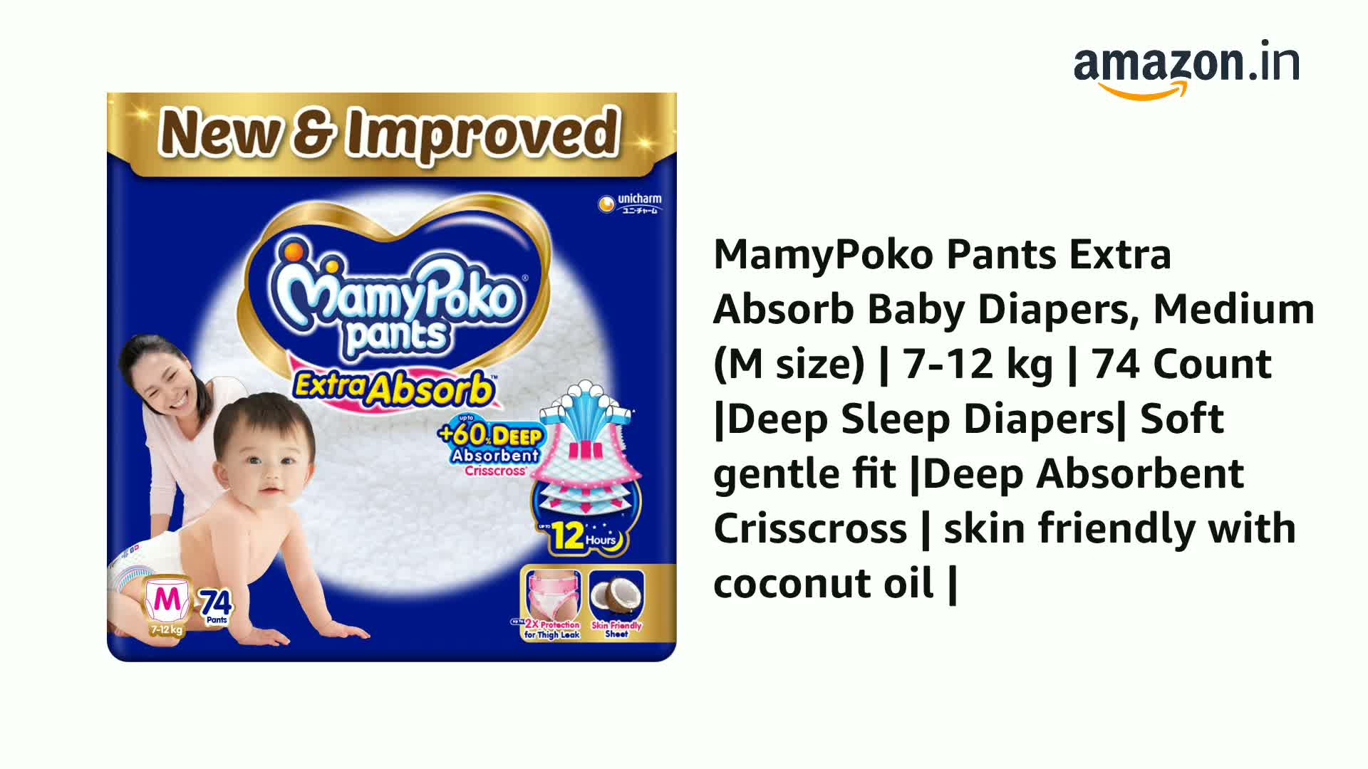 MamyPoko Pants Extra Absorb Baby Diapers, Medium (M size) | 7-12 kg | 74 Count |Deep Sleep Diapers| Soft gentle fit |Deep Absorbent Crisscross | skin friendly with coconut oil |
