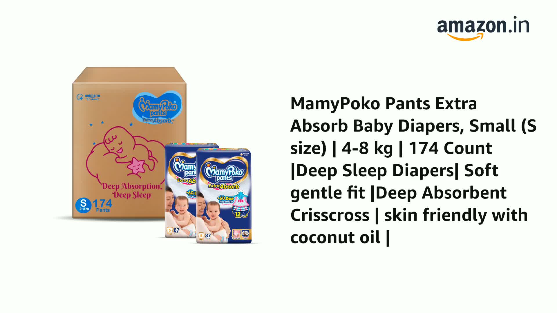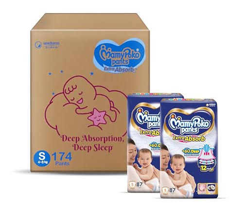 MamyPoko Pants Extra Absorb Baby Diapers, Small (S size) | 4-8 kg | 174 Count |Deep Sleep Diapers| Soft gentle fit |Deep Absorbent Crisscross | skin friendly with coconut oil |