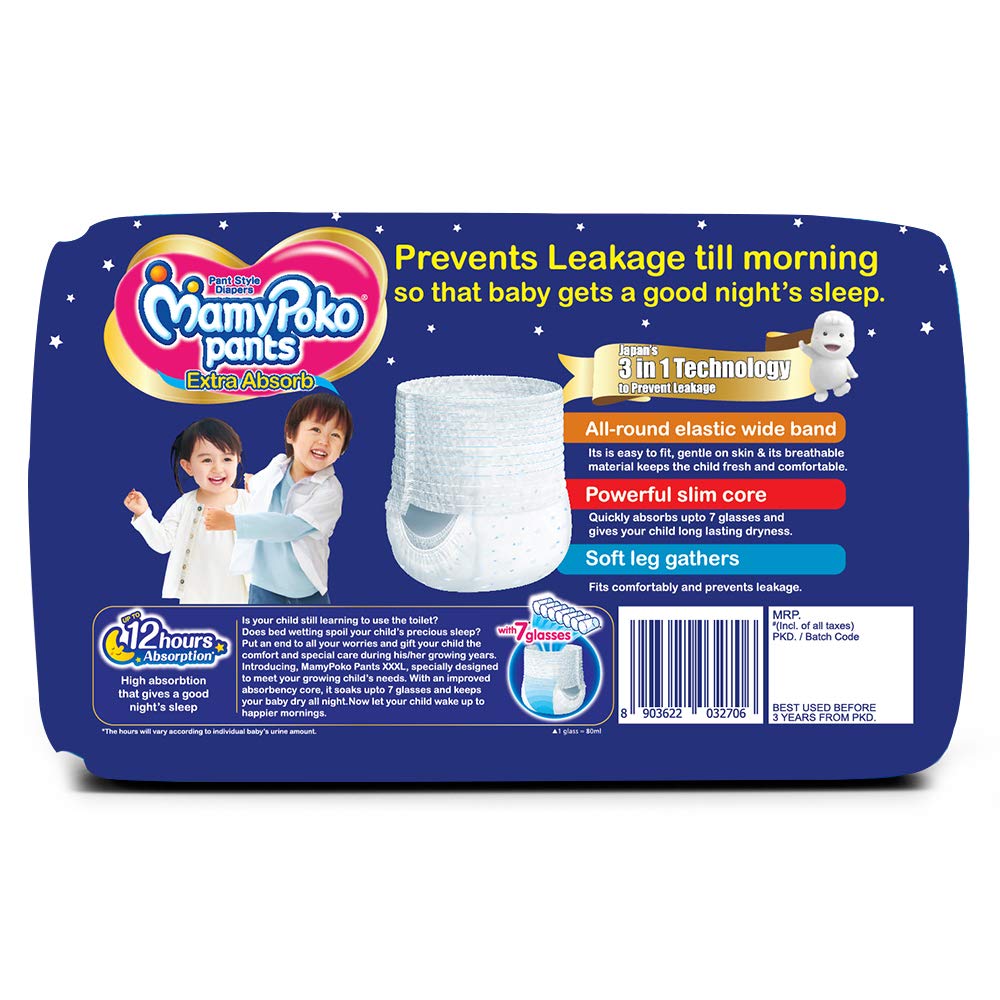 Many kids require special comfort and care during their growing years. With MamyPoko Pants XXXL size let your child's precious sleep be undisturbed and comfortable. With XXXL get tension free as it is specially designed to meet your growing child's needs ! Maximum Shelf Life: 36 Months