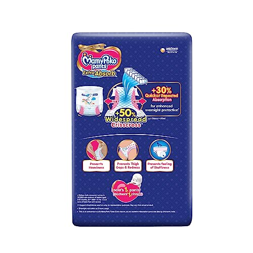 MamyPoko Pants Extra Absorb comes with new "Widespread Crisscross Sheet" with 50% extra absorption area on sides that absorbs urine quickly and repeatedly for upto 12 hours. It prevents leakage without heaviness so the baby & mother sleep peacefully the whole night.