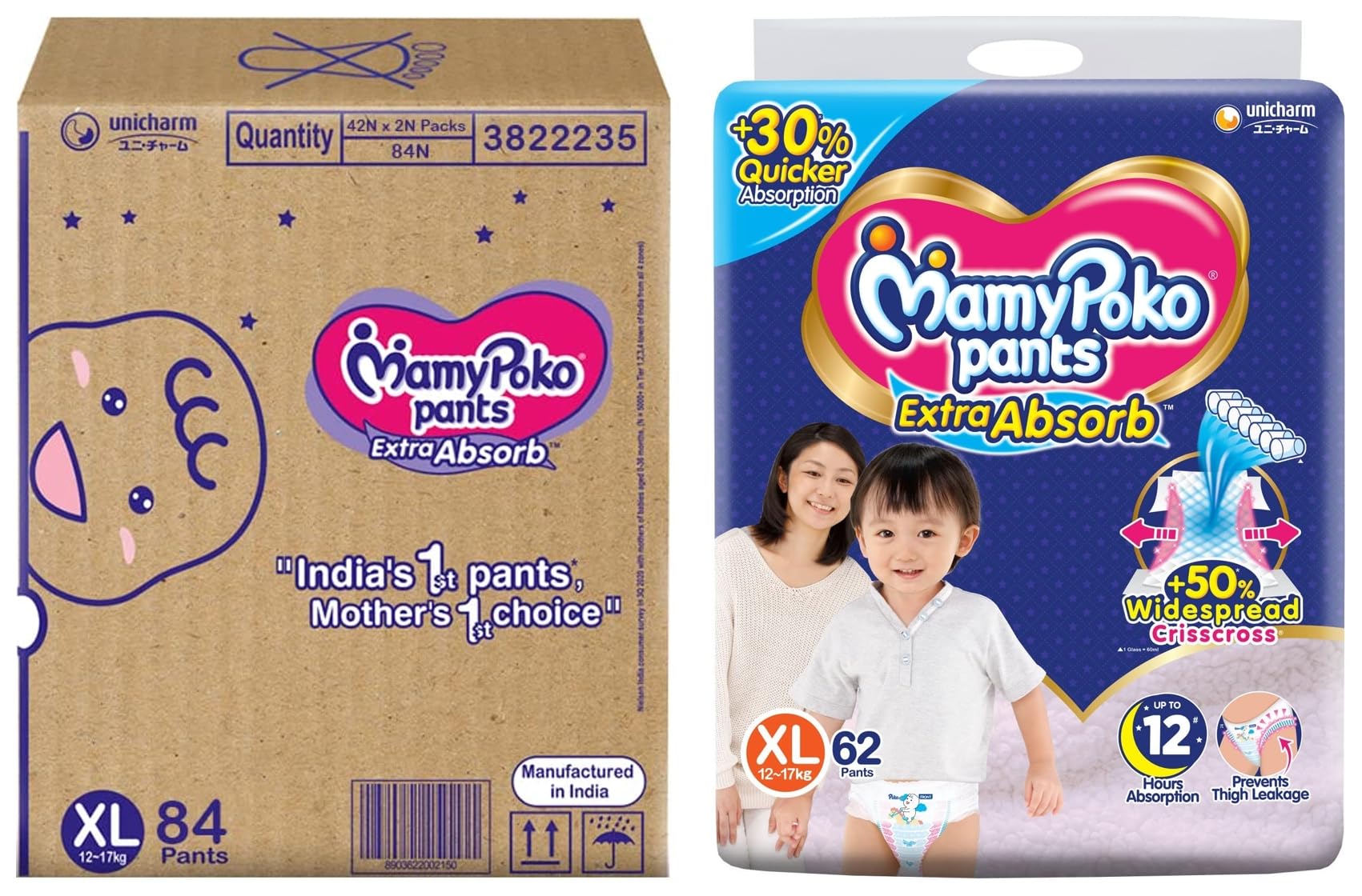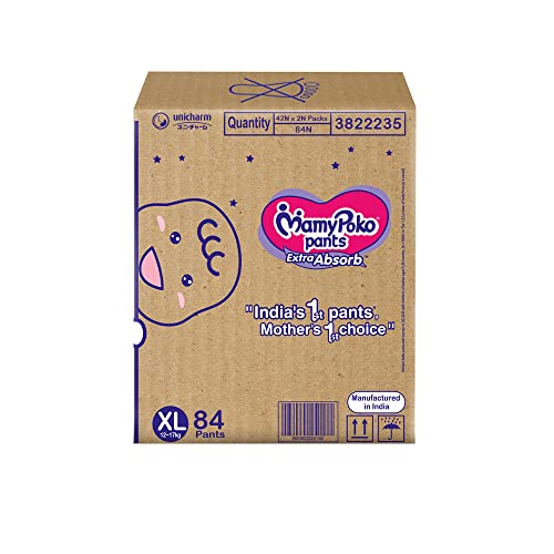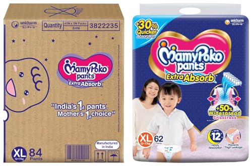 MamyPoko Pants Extra Absorb Baby Diapers X-Large (XL) 84 Count 12-17 kgMamyPoko Pants Extra Absorb comes with "Widespread Crisscross Sheet" with 50% extra absorption area on sides that absorbs urine "+30% more quickly and repeatedly" for upto 12 hours. It prevents leakage without heaviness so the baby & mother sleep peacefully the whole night.MamyPoko Pants Extra Absorb Baby Diapers X-Large (XL) 62 Count 12-17kgMamyPoko Pants Extra Absorb comes with "Widespread Crisscross Sheet" with 50% extra absorption area on sides that absorbs urine "+30% more quickly and repeatedly" for upto 12 hours. It prevents leakage without heaviness so the baby & mother sleep peacefully the whole night.