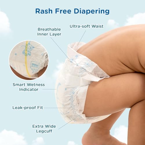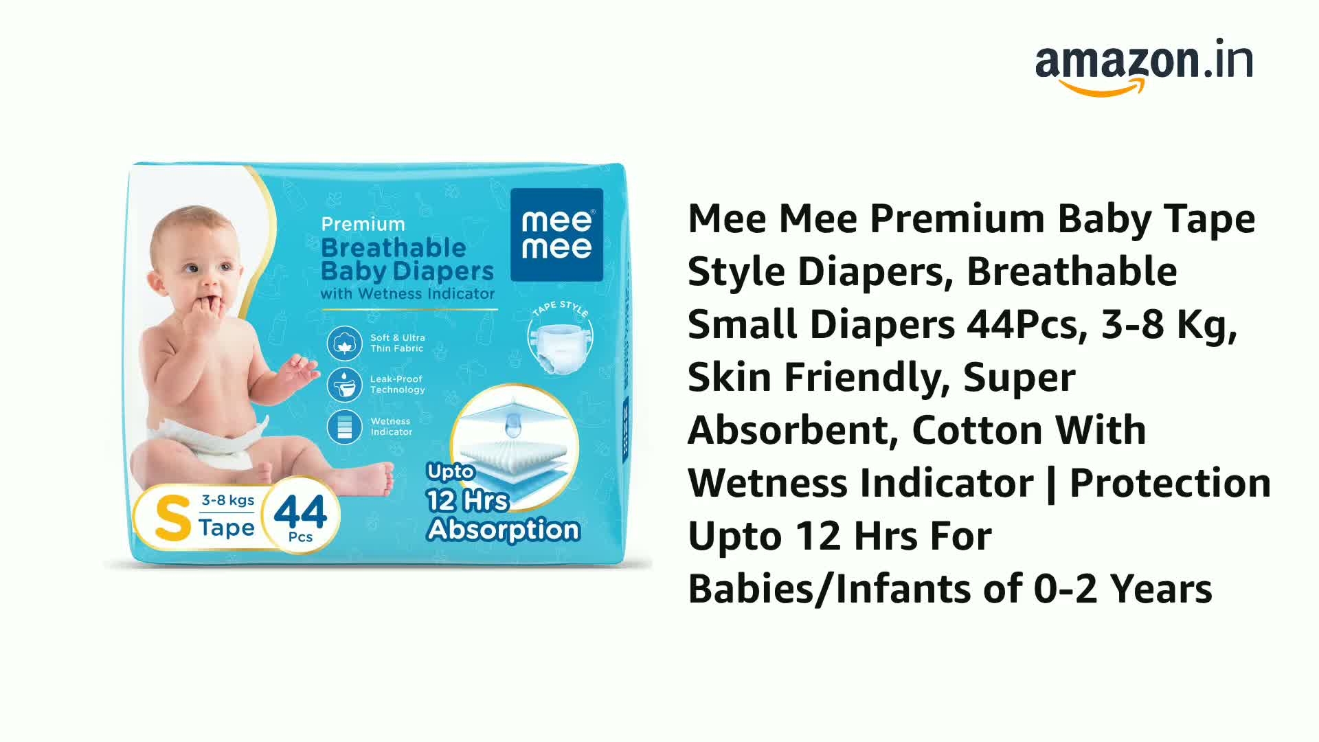 HomeBabyDiaperingBaby DiapersMee Mee Premium Baby Tape Style Diapers, Breathable Small Diapers 44Pcs, 3-8 Kg, Skin Friendly, Super Absorbent, Cotton With Wetness Indicator | Protection Upto 12 Hrs For Babies/Infants of 0-2 Years