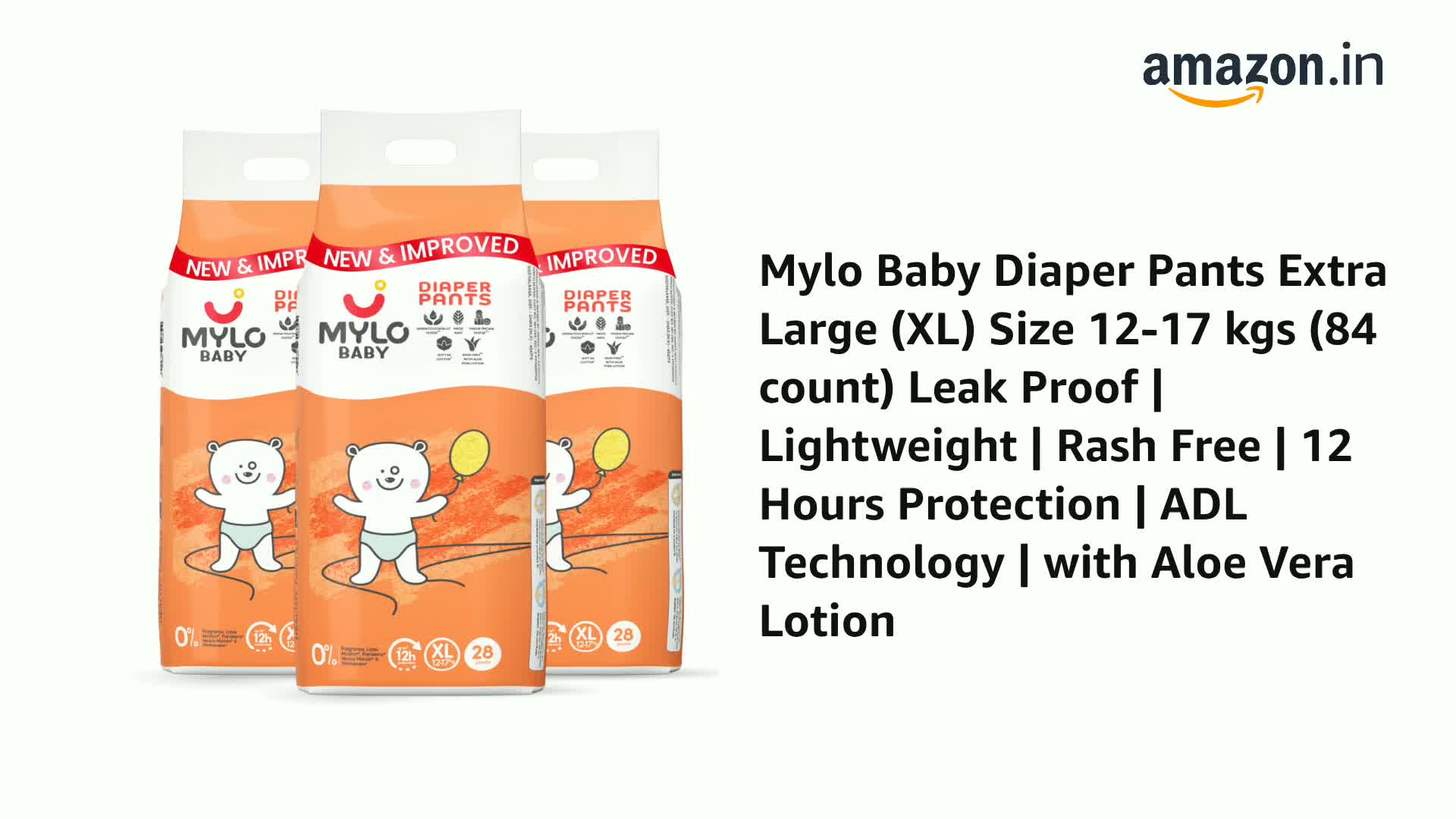 Mylo Baby Diaper Pants Extra Large (XL) Size 12-17 kgs (84 count) Leak Proof | Lightweight | Rash Free | 12 Hours Protection | ADL Technology | with Aloe Vera Lotion