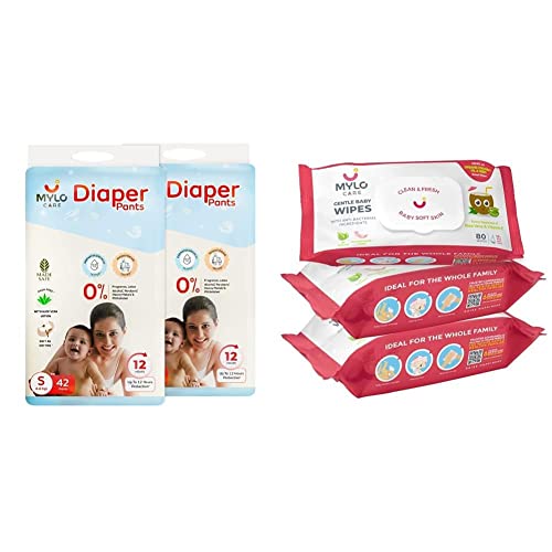 Mylo Care Disposable Diaper Pants & Baby Wipes Combo|Organic Coconut Oil & Neem|12 Hours Leak Protection|Chemical Free|Baby Essentials (Diaper (S)-84 Count, Wipes with lid Pack of 3