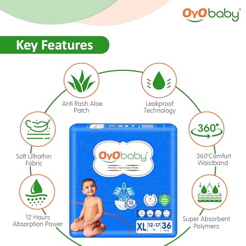 HomeBabyDiaperingBaby DiapersOYO BABY Pant Style Baby Diapers, Pack of 2 - Large (XL), 36Count, for Babies 12-17kg, with Aloe Vera Lotion for Rash Protection & Up to 12 Hours Protection