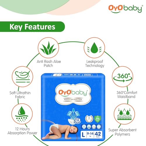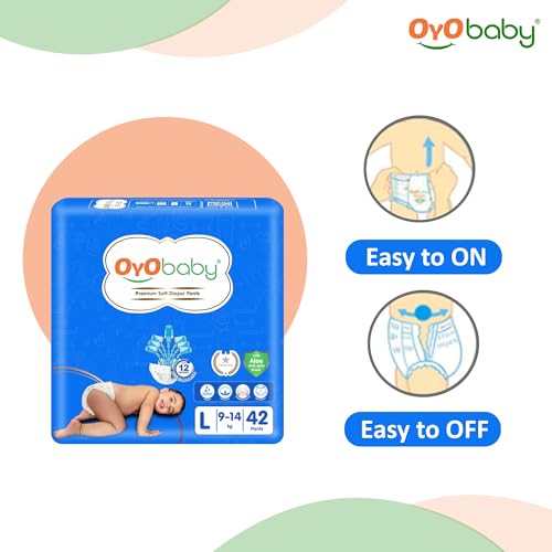 OYO BABY Fastest Absorbing & Long Lasting Dry Night & Comfortable Sleep Style Diaper Pants, Size 9-14 kg Baby 42Count (Pack of 2), Complete Comfort Wonder Pants New Born Baby Diaper Pant