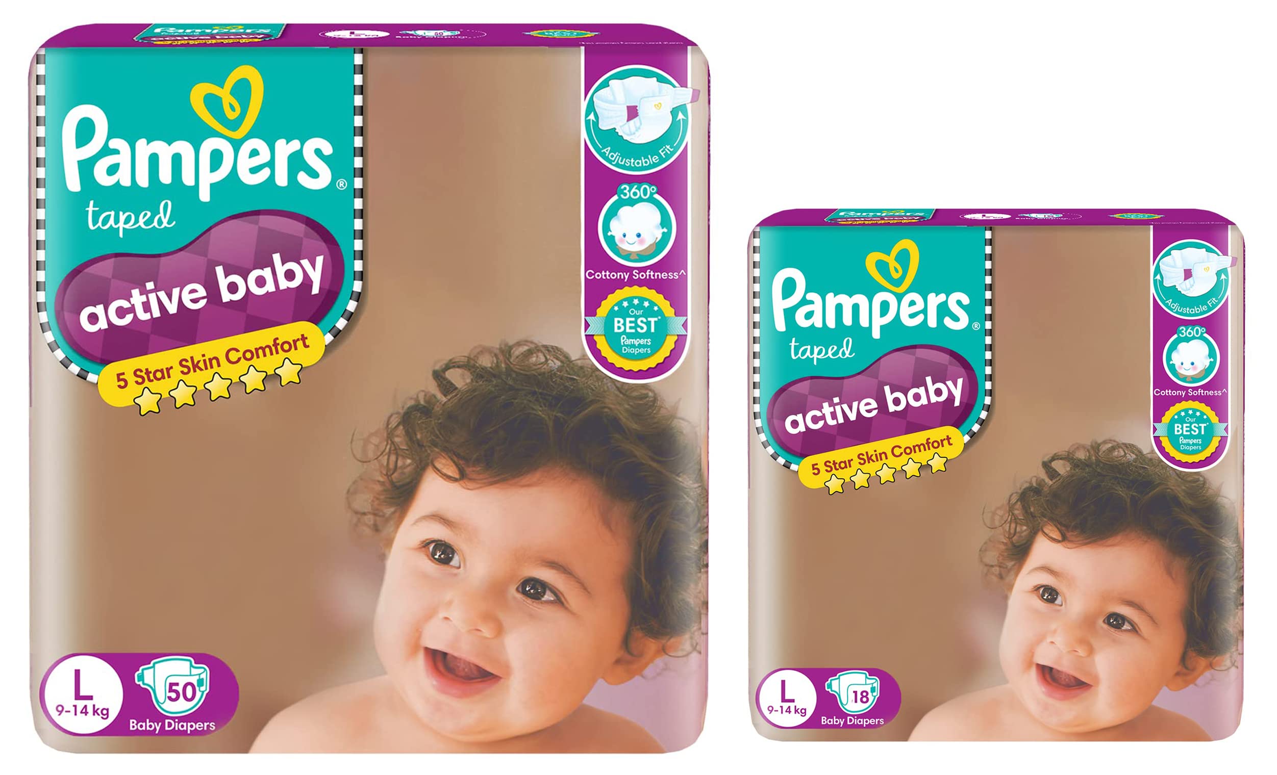 Pampers Active Baby Taped Diapers Medium size diapers (MD) 62 count Taped style custom fit5 Star Skin Protection: The Best tape style diapers from Pampers with an outer layer of cotton-like softness this baby diaper provides intense care to your baby's sensitive skin and protects it effectively from friction rash and redness. These soft and comfort fitting diapers with stretchable sides are best for your baby's rest and playtime. The diaper's fastening tape sticks multiple times thus ensuring it stays in place even after you fasten it after checking your baby's diaper. Protection and nourishment of your baby's skin are taken care of with extracts of moisturising Aloe Vera lotion characteristic of these best baby diapers. These diapers are ultra-thin thanks to the absorbent gel material (AGM) commonly known as Magic Gel. This magic gel core of Pampers diapers is highly effective in absorbing frequent wetness. Naturally your baby's skin remains dry for upto12 hours now no more frequent diaper changing or blow leaks for your little angel. Type: Pant Diapers Keep your baby's skin delicate with 5 star skin protection. Pampers Active Baby comes with 5 features in just one diaper. 12 hours dryness baby lotion cottony softness breathable cover and comfortable fit. 12 Hours Dryness Our driest diaper keeps baby's skin touchably dry for up to 12 hours. Baby Lotion This unique diaper is infused with baby lotion to help prevent diaper rash. Cottony Softness Keep baby's skin free from irritation with cotton-like softness. Breathable Cover Air circulates so baby's skin can breathe easily and stay wonderfully fresh. Comfortable Fit A flexible side stretch design keeps it snug and comfy whether baby is at rest or play. Diaper Sizer Five Features in One Diaper View Larger Comparison Chart View Larger Using Pampers Pants When to Change Right before or right after every feeding After every bowel movement Before bedtime When your baby wakes up When you go out with your baby How to Change Put the diaper under the baby's body. Pull the elastic side properly. Apply both sides in symmetrical position on landing zone. Adjust the cuff around legs on both sides.Pampers Active Baby Taped Diapers Small size diapers (SM) 22 count Taped style custom fit5 Star Skin Protection: The Best tape style diapers from Pampers with an outer layer of cotton-like softness this baby diaper provides intense care to your baby's sensitive skin and protects it effectively from friction rash and redness. These soft and comfort fitting diapers with stretchable sides are best for your baby's rest and playtime. The diaper's fastening tape sticks multiple times thus ensuring it stays in place even after you fasten it after checking your baby's diaper. Protection and nourishment of your baby's skin are taken care of with extracts of moisturising Aloe Vera lotion characteristic of these best baby diapers.. These diapers are ultra-thin thanks to the absorbent gel material (AGM) commonly known as Magic Gel. This magic gel core of Pampers diapers is highly effective in absorbing frequent wetness. Naturally your baby's skin remains dry for upto12 hours now no more frequent diaper changing or blow leaks for your little angel. Keep your baby's skin delicate with 5 star skin protection. Pampers Active Baby comes with 5 features in just one diaper. 12 hours dryness baby lotion cottony softness breathable cover and comfortable fit. 12 Hours Dryness Our driest diaper keeps baby's skin touchably dry for up to 12 hours. Baby Lotion This unique diaper is infused with baby lotion to help prevent diaper rash. Cottony Softness Keep baby's skin free from irritation with cotton-like softness. Breathable Cover Air circulates so baby's skin can breathe easily and stay wonderfully fresh. Comfortable Fit A flexible side stretch design keeps it snug and comfy whether baby is at rest or play. Diaper Sizer Five Features in One Diaper View Larger Comparison Chart View Larger Using Pampers Pants When to Change Right before or right after every feeding After every bowel movement Before bedtime When your baby wakes up When you go out with your baby How to Change Put the diaper under the baby's body. Pull the elastic side properly. Apply both sides in symmetrical position on landing zone. Adjust the cuff around legs on both sides.