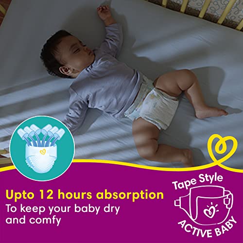 Your little miracle deserves gentle protection & full night sleep and mothers & doctors have always trusted Pampers to provide the care. Presenting New Pampers Active Baby taped diapers which provides your baby 5 star skin protection! How you ask? It has an Adjustable Taped Fit which you can custom-fit as per your baby need. The sides & waist are stretchable with 360 Degree Cottony Softness providing best comfort for your baby skin. Its Extra Dry Layer helps prevent leakage by spreading baby urine evenly and Pampers unique Magic Gel technology © absorbs baby pee full night for up to 12 hrs. This is how these are Our Best Pampers Taped Diapers ever! Taped diapers adjustable custom fit cottony soft 12 hrs absorption best Pampers.