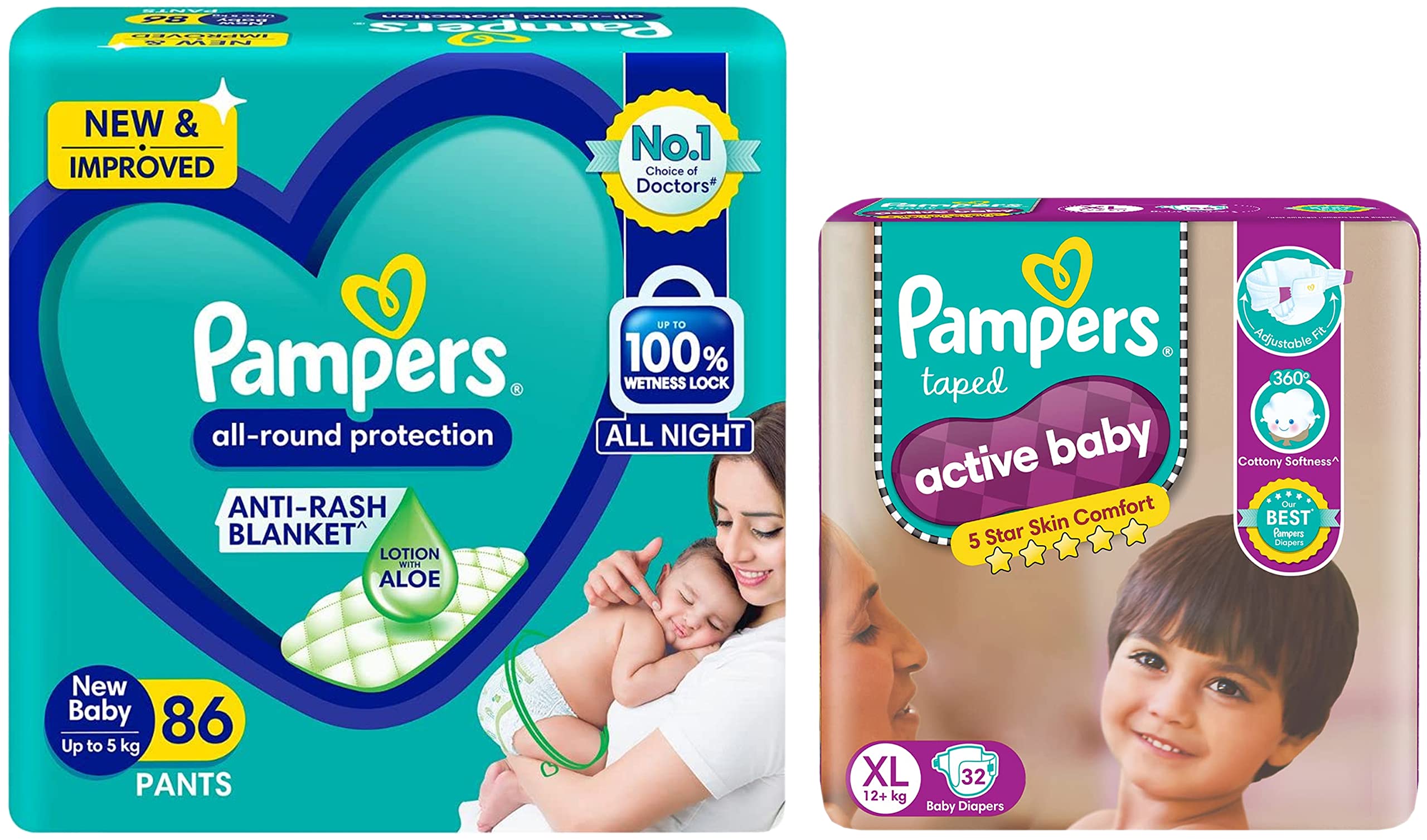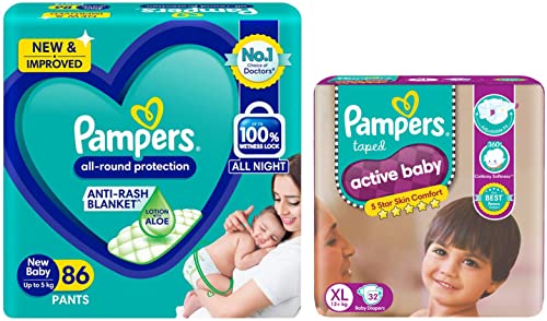 Pampers Active Baby Taped Diapers Extra Large size diapers (XL) 32 count taped style custom fit5 Star Skin Protection: The Best tape style diapers from Pampers with an outer layer of cotton-like softness this baby diaper provides intense care to your baby's sensitive skin and protects it effectively from friction rash and redness. These soft and comfort fitting diapers with stretchable sides are best for your baby's rest and playtime. The diaper's fastening tape sticks multiple times thus ensuring it stays in place even after you fasten it after checking your baby's diaper. Protection and nourishment of your baby's skin are taken care of with extracts of moisturizing Aloe Vera lotion characteristic of these best baby diapers.. These diapers are ultra-thin thanks to the absorbent gel material (AGM) commonly known as Magic Gel. This magic gel core of Pampers diapers is highly effective in absorbing frequent wetness. Naturally your baby's skin remains dry for upto 12 hours now no more frequent diaper changing or blow leaks for your little angel. Keep your baby's skin delicate with 5 star skin protection. Pampers Active Baby comes with 5 features in just one diaper. 12 hours dryness baby lotion cottony softness breathable cover and comfortable fit. 12 Hours Dryness Our driest diaper keeps baby's skin touchably dry for up to 12 hours. Baby Lotion This unique diaper is infused with baby lotion to help prevent diaper rash. Cottony Softness Keep baby's skin free from irritation with cotton-like softness. Breathable Cover Air circulates so baby's skin can breathe easily and stay wonderfully fresh. Comfortable Fit A flexible side stretch design keeps it snug and comfy whether baby is at rest or play. Diaper Sizer Five Features in One Diaper View Larger Comparison Chart View Larger Using Pampers Pants When to Change Right before or right after every feeding After every bowel movement Before bedtime When your baby wakes up When you go out with your baby How to Change Put the diaper under the baby's body. Pull the elastic side properly. Apply both sides in symmetrical position on landing zone. Adjust the cuff around legs on both sides.Pampers All round Protection Pants New Born Extra Small size baby diapers (NBXS) 86 Count Lotion with Aloe VeraNEW & IMPROVED Pampers all-round protection pants have ANTI-RASH BLANKET* containing Lotion with Aloe Vera to keep your baby’s skin protected from redness irritation and rashes. quality diapers with 100% WETNESS LOCK keeps the pee locked inside & baby's bum stays dry for ALL NIGHT. Air channels & stretchy belt provides your baby breathable airy fit - comfortable even in summers. Pampers unique Magic gel technology provides up to 12 hours of dryness – and has 2X faster absorption. The new and improved product design enables a comfortable fit closer to the baby’s body and an EXTRA SOFT flexible waist band that adapts to baby’s movements for best comfort. Available in all sizes – Small diapers medium diaper pants large size diaper pants XL diapers XXL diapers XXXL diaper pants. A top layer with cotton-like soft material ensure a comfortable night’s sleep. Our pants with fun exterior graphics fun designs of characters and a delightful fresh Aloe fragrance ensures you enjoy every change with your baby. (*Blanket refers to soft topsheet with lotion. Helps prevent rash due to wetness after 1 day of usage based on clinical studies in USA 2000-2019).