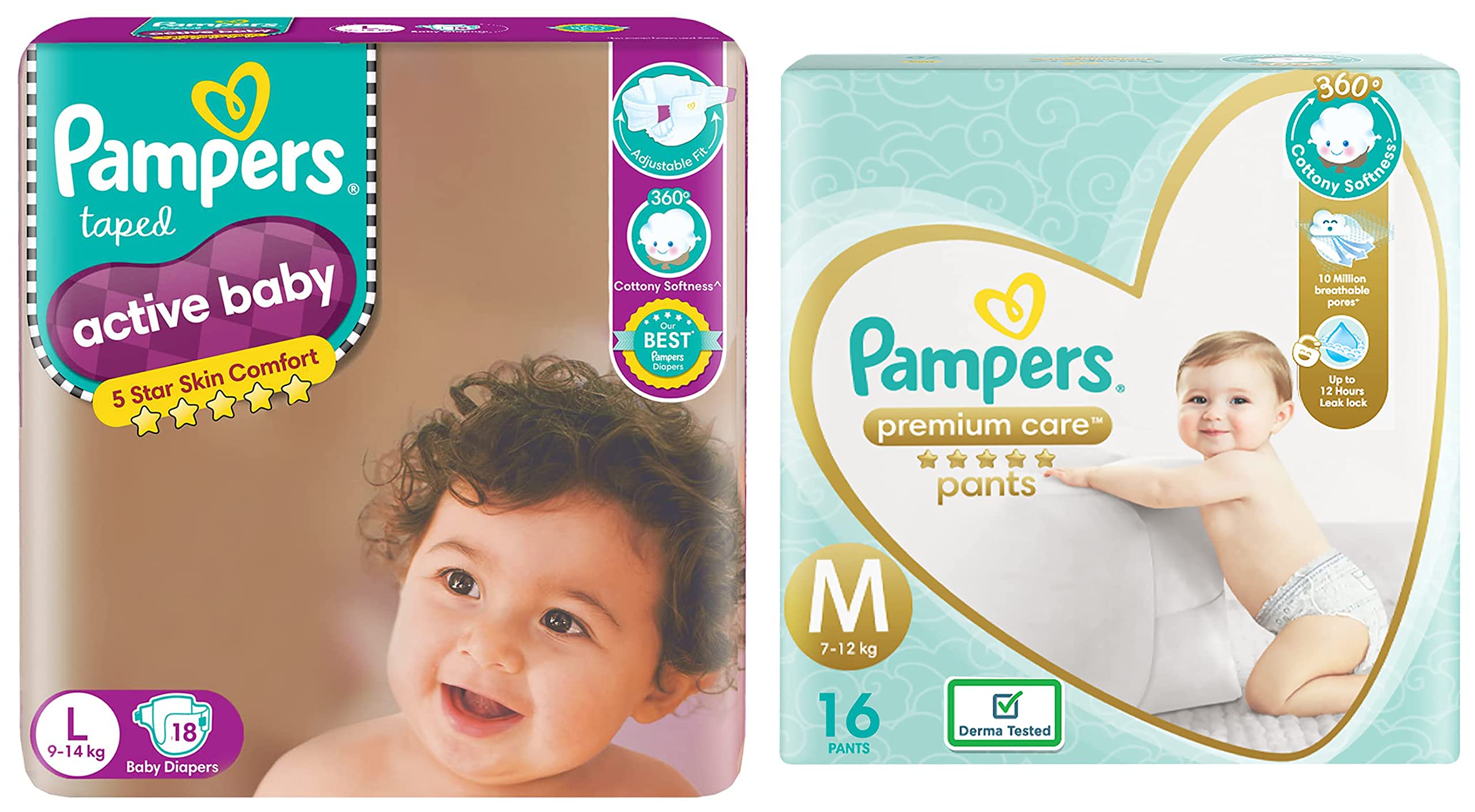 Pampers Active Baby Taped Diapers Large size diapers (L) 18 count taped style custom fit5 Star Skin Protection: The Best tape style diapers from Pampers with an outer layer of cotton-like softness this baby diaper provides intense care to your baby's sensitive skin and protects it effectively from friction rash and redness. These soft and comfort fitting diapers with stretchable sides are best for your baby's rest and playtime. The diaper's fastening tape sticks multiple times thus ensuring it stays in place even after you fasten it after checking your baby's diaper. Protection and nourishment of your baby's skin are taken care of with extracts of moisturizing Aloe Vera lotion characteristic of these best baby diapers.. These diapers are ultra-thin thanks to the absorbent gel material (AGM) commonly known as Magic Gel. This magic gel core of Pampers diapers is highly effective in absorbing frequent wetness. Naturally your baby's skin remains dry for upto12 hours now no more frequent diaper changing or blow leaks for your little angel.Pampers Premium Care Pants Medium size baby diapers (MD) 16 Count Softest ever Pampers pantsNew Pampers Premium Pants with cotton like soft materials is best for your baby delicate skin. Pampers Premium Pants contain lotion with Aloe Vera and 3 Air Channels which helps your baby skin breathe. Experience 5 Star comfort with unique added features like Wetness Indicator which turns Yellow to Blue indication when you may change and Disposal Tape which helps you in easy disposal. Pampers Premium Pants are available in New-born (NB) S M L XL and XXL sizes.