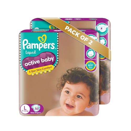 Pampers Active Baby Taped Diapers, Large size diapers, (LG) 50 count, taped style custom fit (Pack of 2)