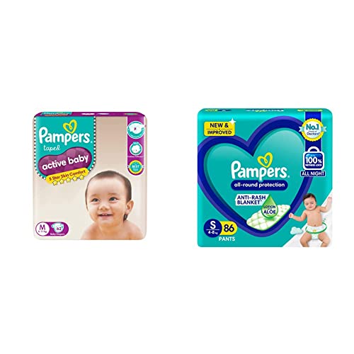 Pampers Active Baby Taped Diapers Medium size diapers (MD) 62 count taped style custom fit5 Star Skin Protection: The Best tape style diapers from Pampers with an outer layer of cotton-like softness this baby diaper provides intense care to your baby's sensitive skin and protects it effectively from friction rash and redness. These soft and comfort fitting diapers with stretchable sides are best for your baby's rest and playtime. The diaper's fastening tape sticks multiple times thus ensuring it stays in place even after you fasten it after checking your baby's diaper. Protection and nourishment of your baby's skin are taken care of with extracts of moisturizing Aloe Vera lotion characteristic of these best baby diapers.. These diapers are ultra-thin thanks to the absorbent gel material (AGM) commonly known as Magic Gel. This magic gel core of Pampers diapers is highly effective in absorbing frequent wetness. Naturally your baby's skin remains dry for upto 12 hours now no more frequent diaper changing or blow leaks for your little angel. Keep your baby's skin delicate with 5 star skin protection. Pampers Active Baby comes with 5 features in just one diaper. 12 hours dryness baby lotion cottony softness breathable cover and comfortable fit. 12 Hours Dryness Our driest diaper keeps baby's skin touchably dry for up to 12 hours. Baby Lotion This unique diaper is infused with baby lotion to help prevent diaper rash. Cottony Softness Keep baby's skin free from irritation with cotton-like softness. Breathable Cover Air circulates so baby's skin can breathe easily and stay wonderfully fresh. Comfortable Fit A flexible side stretch design keeps it snug and comfy whether baby is at rest or play. Diaper Sizer Five Features in One Diaper View Larger Comparison Chart View Larger Using Pampers Pants When to Change Right before or right after every feeding After every bowel movement Before bedtime When your baby wakes up When you go out with your baby How to Change Put the diaper under the baby's body. Pull the elastic side properly. Apply both sides in symmetrical position on landing zone. Adjust the cuff around legs on both sides.Pampers All round Protection Pants Small size baby Diapers (S) 86 Count Lotion with Aloe VeraNEW & IMPROVED Pampers all-round protection pants have ANTI-RASH BLANKET* containing Lotion with Aloe Vera to keep your baby’s skin protected from redness irritation and rashes. Best quality diapers with 100% WETNESS LOCK keeps the pee locked inside & baby's bum stays dry for ALL NIGHT. Air channels & stretchy belt provides your baby breathable airy fit - comfortable even in summers. Pampers unique Magic gel technology provides up to 12 hours of dryness – and has 2X faster absorption. The new and improved product design enables a comfortable fit closer to the baby’s body and an EXTRA SOFT flexible waist band that adapts to baby’s movements for best comfort. Available in all sizes – Small diapers medium diaper pants large size diaper pants XL diapers XXL diapers XXXL diaper pants. A top layer with cotton-like soft material ensure a comfortable night’s sleep. Our pants with fun exterior graphics fun designs of characters and a delightful fresh Aloe fragrance ensures you enjoy every change with your baby. (*Blanket refers to soft topsheet with lotion. Helps prevent rash due to wetness after 1 day of usage based on clinical studies in USA 2000-2019).