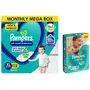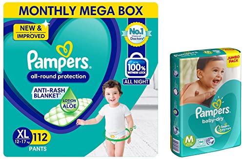 Pampers All round Protection Pants Extra Large size baby Diapers (XL) 112 Count Lotion with Aloe VeraNEW IMPROVED Pampers all round protection pants have ANTI RASH BLANKET* containing Lotion with Aloe Vera to keep your baby’s skin protected from redness and rashes. Top quality diaper pants with Up to 100% WETNESS LOCK keeps the pee locked inside and baby's bum stays dry for ALL NIGHT. Air channels & stretchy belt provides your baby breathable airy fit comfortable even in summers. Pampers unique Magic gel technology provides up to 12 hours of dryness and has up to 2X faster absorption The new and improved design has an EXTRA SOFT material and a fit that adapts to baby’s movements for best comfort. Available in all sizes Small diapers medium diaper pants large size diaper pants XL diapers XXL diapers XXXL diaper pants. Our pants with fun exterior graphics fun designs of characters and a delightful fresh Aloe fragrance ensures you enjoy every change with your baby (*Blanket refers to soft topsheet with lotion Helps prevent rash due to wetness after 1 day of usage based on clinical studies in USA 2000 2019)Pampers Taped Baby Diapers Medium (MD) 66 countNEW & IMPROVED Pampers all-round protection pants have ANTI-RASH BLANKET* containing Lotion with Aloe Vera to keep your baby’s skin protected from redness irritation and rashes. quality diapers with 100% WETNESS LOCK keeps the pee locked inside & baby's bum stays dry for ALL NIGHT. Air channels & stretchy belt provides your baby breathable airy fit - comfortable even in summers. Pampers unique Magic gel technology provides up to 12 hours of dryness – and has 2X faster absorption. The new and improved product design enables a comfortable fit closer to the baby’s body and an EXTRA SOFT flexible waist band that adapts to baby’s movements for best comfort. Available in all sizes – Small diapers medium diaper pants large size diaper pants XL diapers XXL diapers XXXL diaper pants. A top layer with cotton-like soft material ensure a comfortable night’s sleep. Our pants with fun exterior graphics fun designs of characters and a delightful fresh Aloe fragrance ensures you enjoy every change with your baby. (*Blanket refers to soft topsheet with lotion. Helps prevent rash due to wetness after 1 day of usage based on clinical studies in USA 2000-2019). view larger Size chart Now New Pampers with magic gel can absorb quicker and hence keep the skin dry for upto 10 hours. So your baby's skin will be dry throughout the night and give him a peaceful undisturbed golden sleep. When to Change a Diaper In the first couple of months you may find yourself changing diapers up to 10 times in 24 hours. Diapers should be changed whenever they are wet or soiled. Your baby will often (but not always) let you know. With a super-absorbent diaper like Pampers diapers you can tell if it's wet by urine indicator or by feeling for lumps in the absorbent material. Here are some common times for changing diapers: Right before or right after every feeding After every bowel movement Before bedtime When your baby wakes up When you go out with your baby The Art of Changing Diapers Pampers Diapers are designed to adjust to your baby's shape for a snug comfortable fit. While changing diapers there's no need to fold the waistband in or out or to adjust the leg cuffs. Place tabs parallel to the waistband and centered on the character strip. Use the characters as guides to ensure the fasteners are evenly spaced. Keep baby products such as powder away from the fasteners so they maintain their stickiness. Wiping baby bottoms Have a supply of baby wipes or clean wet tissues handy while changing diapers to help keep your baby clean and fresh. For baby girls while changing diapers always wipe from front to back to minimize the amount of stool material that gets near her genitals. Also be careful to clean all areas as the folds in the skin around her genitals can hide urine and soil. Treating and preventing diaper rash Red bumps on your baby's bottom may mean diaper rash. It can be caused by many factors including leaving urine or bowel movement on the skin too long between changing diapers or even as a result of taking antibiotics. And when your baby starts solid foods wait a few days between introducing each new food to see if the rash was caused by a particular food. If your baby has diaper rash clean the entire diapered area gently but thoroughly with a baby wipe or a clean wet tissue. It is also helpful to allow air to reach the skin. Talk to your paediatrician or pharmacist if the rash does not improve. Finding the right size Just like you babies like to wear things that fit just right. Choose a size that does not sag or gap even as your baby crawls and plays. This will help prevent leaks. Each product description on this site gives guidelines that represent the average weight for a particular size. And remember when you move up a size you gain absorbency. Weighing babies The easiest way to weigh your baby is to first hop on the scale yourself. See how much you weigh then see how much you weigh when you hold your baby. If you subtract your weight you'll know how much your baby weighs. Safe diapering You buy the latest toys and babies wind up playing with silly things - like diapers. It's important to keep diapers where they should be on your baby's bottom. Don't let your baby put the diaper in her mouth. Discard any diaper that has become torn or unsealed and read the warning label on all bags. Diaper gel facts AGM is the absorbent gelling material widely used in diaper padding to absorb wetness. It is perfectly normal to see some gel on the skin from time to time especially if the diaper is heavily saturated. It can easily be removed by wiping your baby's skin. This material has a long history of safe use in a variety of products and has been in diapers for more than a decade. Absorbent gelling material is closely related to ingredients widely used in cosmetics in food 