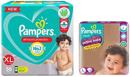 Pampers All round Protection Pants Extra Large size baby Diapers (XL) 56 Count Lotion with Aloe VeraNEW & IMPROVED Pampers all-round protection pants have ANTI-RASH BLANKET* containing Lotion with Aloe Vera to keep your baby skin protected from redness irritation and rashes. quality diapers with 100% WETNESS LOCK keeps the pee locked inside & baby's bum stays dry for ALL NIGHT. Air channels & stretchy belt provides your baby breathable airy fit - comfortable even in summers. Pampers unique Magic gel technology provides up to 12 hours of dryness and has 2X faster absorption. The new and improved product design enables a comfortable fit closer to the baby body and an EXTRA SOFT flexible waist band that adapts to baby movements for best comfort. Available in all sizes Small diapers medium diaper pants large size diaper pants XL diapers XXL diapers XXXL diaper pants. A top layer with cotton-like soft material ensure a comfortable night sleep. Our pants with fun exterior graphics fun designs of characters and a delightful fresh Aloe fragrance ensures you enjoy every change with your baby. (*Blanket refers to soft topsheet with lotion. Helps prevent rash due to wetness after 1 day of usage based on clinical studies in USA 2000-2019).Pampers Active Baby Taped Diapers Large size diapers (L) 18 count taped style custom fit5 Star Skin Protection: The Best tape style diapers from Pampers with an outer layer of cotton-like softness this baby diaper provides intense care to your baby's sensitive skin and protects it effectively from friction rash and redness. These soft and comfort fitting diapers with stretchable sides are best for your baby's rest and playtime. The diaper's fastening tape sticks multiple times thus ensuring it stays in place even after you fasten it after checking your baby's diaper. Protection and nourishment of your baby's skin are taken care of with extracts of moisturizing Aloe Vera lotion characteristic of these best baby diapers.. These diapers are ultra-thin thanks to the absorbent gel material (AGM) commonly known as Magic Gel. This magic gel core of Pampers diapers is highly effective in absorbing frequent wetness. Naturally your baby's skin remains dry for upto12 hours now no more frequent diaper changing or blow leaks for your little angel.
