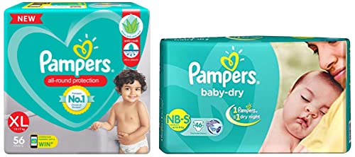 Pampers All round Protection Pants Extra Large size baby Diapers (XL) 56 Count Lotion with Aloe VeraNEW & IMPROVED Pampers all-round protection pants have ANTI-RASH BLANKET* containing Lotion with Aloe Vera to keep your baby skin protected from redness irritation and rashes. quality diapers with 100% WETNESS LOCK keeps the pee locked inside & baby's bum stays dry for ALL NIGHT. Air channels & stretchy belt provides your baby breathable airy fit - comfortable even in summers. Pampers unique Magic gel technology provides up to 12 hours of dryness and has 2X faster absorption. The new and improved product design enables a comfortable fit closer to the baby body and an EXTRA SOFT flexible waist band that adapts to baby movements for best comfort. Available in all sizes Small diapers medium diaper pants large size diaper pants XL diapers XXL diapers XXXL diaper pants. A top layer with cotton-like soft material ensure a comfortable night sleep. Our pants with fun exterior graphics fun designs of characters and a delightful fresh Aloe fragrance ensures you enjoy every change with your baby. (*Blanket refers to soft topsheet with lotion. Helps prevent rash due to wetness after 1 day of usage based on clinical studies in USA 2000-2019).Pampers Taped Baby Diapers Small (SM) 46 countNEW & IMPROVED Pampers all-round protection pants have ANTI-RASH BLANKET* containing Lotion with Aloe Vera to keep your baby skin protected from redness irritation and rashes. quality diapers with 100% WETNESS LOCK keeps the pee locked inside & baby's bum stays dry for ALL NIGHT. Air channels & stretchy belt provides your baby breathable airy fit - comfortable even in summers. Pampers unique Magic gel technology provides up to 12 hours of dryness and has 2X faster absorption. The new and improved product design enables a comfortable fit closer to the baby body and an EXTRA SOFT flexible waist band that adapts to baby movements for best comfort. Available in all sizes Small diapers medium diaper pants large size diaper pants XL diapers XXL diapers XXXL diaper pants. A top layer with cotton-like soft material ensure a comfortable night sleep. Our pants with fun exterior graphics fun designs of characters and a delightful fresh Aloe fragrance ensures you enjoy every change with your baby. (*Blanket refers to soft topsheet with lotion. Helps prevent rash due to wetness after 1 day of usage based on clinical studies in USA 2000-2019).
