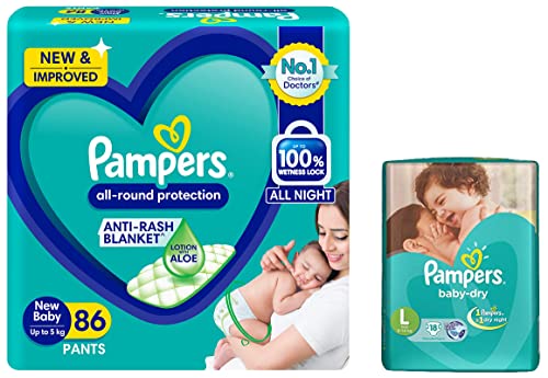 Pampers All round Protection Pants New Born Extra Small size baby diapers (NBXS) 86 Count Lotion with Aloe VeraNEW IMPROVED Pampers all round protection pants have ANTI RASH BLANKET* containing Lotion with Aloe Vera to keep your baby’s skin protected from redness and rashes. Top quality diaper pants with Up to 100% WETNESS LOCK keeps the pee locked inside and baby's bum stays dry for ALL NIGHT. Air channels & stretchy belt provides your baby breathable airy fit comfortable even in summers. Pampers unique Magic gel technology provides up to 12 hours of dryness and has up to 2X faster absorption The new and improved design has an EXTRA SOFT material and a fit that adapts to baby’s movements for best comfort. Available in all sizes Small diapers medium diaper pants large size diaper pants XL diapers XXL diapers XXXL diaper pants. Our pants with fun exterior graphics fun designs of characters and a delightful fresh Aloe fragrance ensures you enjoy every change with your baby (*Blanket refers to soft topsheet with lotion Helps prevent rash due to wetness after 1 day of usage based on clinical studies in USA 2000 2019)Pampers Taped Diapers Large (LG) 18 count for KidsNEW & IMPROVED Pampers all-round protection pants have ANTI-RASH BLANKET* containing Lotion with Aloe Vera to keep your baby’s skin protected from redness irritation and rashes. quality diapers with 100% WETNESS LOCK keeps the pee locked inside & baby's bum stays dry for ALL NIGHT. Air channels & stretchy belt provides your baby breathable airy fit - comfortable even in summers. Pampers unique Magic gel technology provides up to 12 hours of dryness – and has 2X faster absorption. The new and improved product design enables a comfortable fit closer to the baby’s body and an EXTRA SOFT flexible waist band that adapts to baby’s movements for best comfort. Available in all sizes – Small diapers medium diaper pants large size diaper pants XL diapers XXL diapers XXXL diaper pants. A top layer with cotton-like soft material ensure a comfortable night’s sleep. Our pants with fun exterior graphics fun designs of characters and a delightful fresh Aloe fragrance ensures you enjoy every change with your baby. (*Blanket refers to soft topsheet with lotion. Helps prevent rash due to wetness after 1 day of usage based on clinical studies in USA 2000-2019).