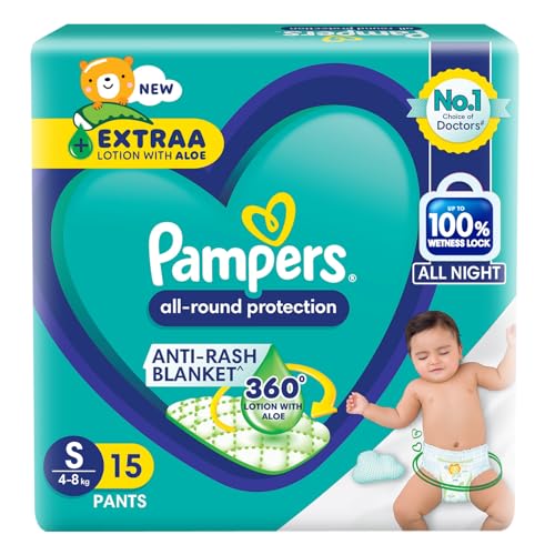 Pampers All Round Protection Pant Style Baby Diapers are available in New born (NB) Small (S) Medium (M) Large (L) X-Large (XL) XX-Large (XXL) XXX-Large (XXXL) sizes. NEW and IMPROVED Pampers all round protection pants have ANTI RASH BLANKET* containing Lotion with Aloe Vera to keep your baby skin protected from redness and rashes. Top quality diaper pants with Up to 100% WETNESS LOCK keeps the pee locked inside and baby's bum stays dry for ALL NIGHT. Air channels & stretchy belt provides your baby breathable airy fit comfortable even in summers. Pampers unique Magic gel technology provides up to 12 hours of dryness and has up to 2X faster absorption The new and improved design has an EXTRA SOFT material and a fit that adapts to baby movements for best comfort. Our pants with fun exterior graphics fun designs of characters and a delightful fresh Aloe fragrance ensures you enjoy every change with your baby (*Blanket refers to soft topsheet with lotion Helps prevent rash due to wetness after 1 day of usage based on clinical studies in USA 2000 2019)