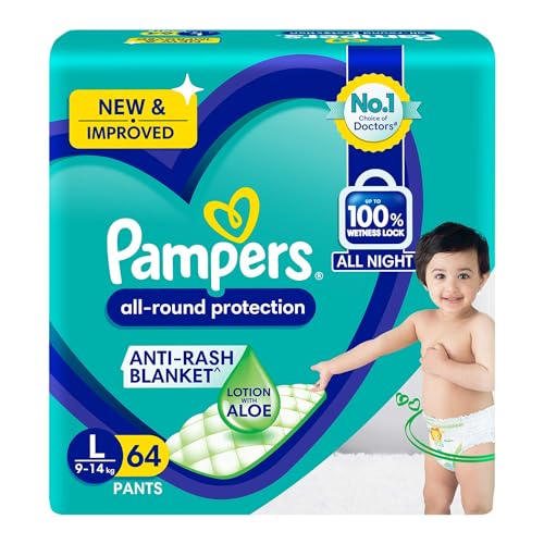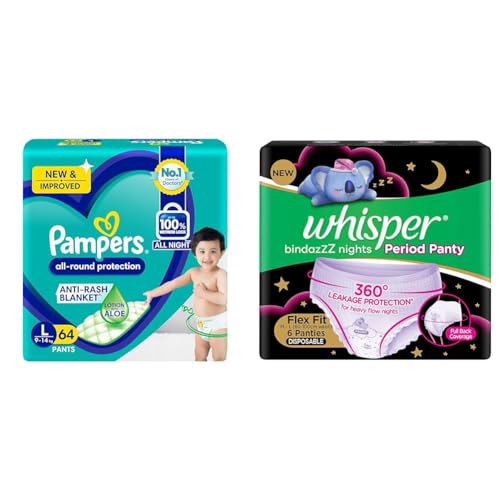 Pampers All round Protection Pants Style Baby Diapers Large (L) Size 64 Count Anti Rash Blanket Lotion with Aloe Vera 9-14kg DiapersPampers All Round Protection Pant Style Baby Diapers are available in New born (NB) Small (S) Medium (M) Large (L) X-Large (XL) XX-Large (XXL) XXX-Large (XXXL) sizes. NEW and IMPROVED Pampers all round protection pants have ANTI RASH BLANKET* containing Lotion with Aloe Vera to keep your baby’s skin protected from redness and rashes. Top quality diaper pants with Up to 100% WETNESS LOCK keeps the pee locked inside and baby's bum stays dry for ALL NIGHT. Air channels & stretchy belt provides your baby breathable airy fit comfortable even in summers. Pampers unique Magic gel technology provides up to 12 hours of dryness and has up to 2X faster absorption The new and improved design has an EXTRA SOFT material and a fit that adapts to baby’s movements for best comfort. Our pants with fun exterior graphics fun designs of characters and a delightful fresh Aloe fragrance ensures you enjoy every change with your baby (*Blanket refers to soft topsheet with lotion Helps prevent rash due to wetness after 1 day of usage based on clinical studies in USA 2000 2019)Whisper Bindazzz Night Period Panty|6 M-L Panties|upto 0% Leaks|360 degree leakage protection|Full back coverage|Suitable for Heavy Flow|Flex fit|Soft & comfortable|With disposable wrapWhisper Bindazzz Nights Period Panty gives you 360-degree leakage protection for your heavy flow nights. It offers you full back coverage for a worry-free sleep. Its panty-like fit lets you sleep in any position you want. Whisper Bindazzz Nights Period Panties are soft & comfortable and gives you 360-degree coverage so you have no worry of stains.