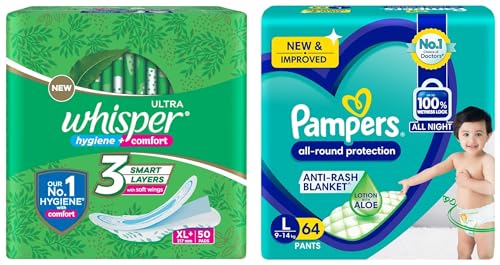 Pampers All round Protection Pants Style Baby Diapers Large (L) Size 64 Count Anti Rash Blanket Lotion with Aloe Vera 9-14kg DiapersPampers All Round Protection Pant Style Baby Diapers are available in New born (NB) Small (S) Medium (M) Large (L) X-Large (XL) XX-Large (XXL) XXX-Large (XXXL) sizes. NEW and IMPROVED Pampers all round protection pants have ANTI RASH BLANKET* containing Lotion with Aloe Vera to keep your baby’s skin protected from redness and rashes. Top quality diaper pants with Up to 100% WETNESS LOCK keeps the pee locked inside and baby's bum stays dry for ALL NIGHT. Air channels & stretchy belt provides your baby breathable airy fit comfortable even in summers. Pampers unique Magic gel technology provides up to 12 hours of dryness and has up to 2X faster absorption The new and improved design has an EXTRA SOFT material and a fit that adapts to baby’s movements for best comfort. Our pants with fun exterior graphics fun designs of characters and a delightful fresh Aloe fragrance ensures you enjoy every change with your baby (*Blanket refers to soft topsheet with lotion Helps prevent rash due to wetness after 1 day of usage based on clinical studies in USA 2000 2019)Whisper Ultra Clean Sanitary Pads for Women|50 thin Pads|XL+|Hygiene & Comfort|Soft Wings|Dry top sheet|Suitable for Heavy flow|Odour free|31.7 cm Long|With disposable wrapWhisper Ultra Clean is our No 1 Hygienic Protection Range now with Herbal Oil and locks not just wetness but also odour. The pads are nearly 40% longer versus ordinary pads for long lasting coverage and have a DRI weave cover that absorbs in seconds with a delightful scent for all day freshness