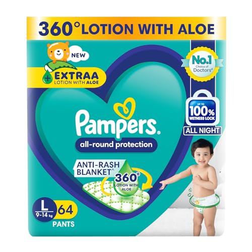 Pampers All Round Protection Pant Style Baby Diapers are available in New born (NB) Small (S) Medium (M) Large (L) X-Large (XL) XX-Large (XXL) XXX-Large (XXXL) sizes. NEW and IMPROVED Pampers all round protection pants have ANTI RASH BLANKET* containing Lotion with Aloe Vera to keep your baby skin protected from redness and rashes. Top quality diaper pants with Up to 100% WETNESS LOCK keeps the pee locked inside and baby's bum stays dry for ALL NIGHT. Air channels & stretchy belt provides your baby breathable airy fit comfortable even in summers. Pampers unique Magic gel technology provides up to 12 hours of dryness and has up to 2X faster absorption The new and improved design has an EXTRA SOFT material and a fit that adapts to baby movements for best comfort. Our pants with fun exterior graphics fun designs of characters and a delightful fresh Aloe fragrance ensures you enjoy every change with your baby (*Blanket refers to soft topsheet with lotion Helps prevent rash due to wetness after 1 day of usage based on clinical studies in USA 2000 2019)