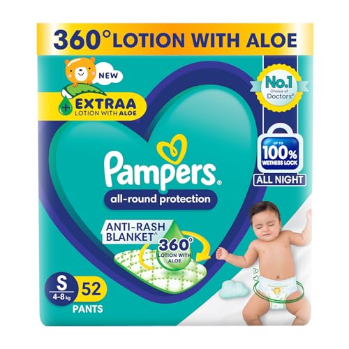 Pampers All Round Protection Pant Style Baby Diapers are available in New born (NB) Small (S) Medium (M) Large (L) X-Large (XL) XX-Large (XXL) XXX-Large (XXXL) sizes. NEW and IMPROVED Pampers all round protection pants have ANTI RASH BLANKET* containing Lotion with Aloe Vera to keep your baby skin protected from redness and rashes. Top quality diaper pants with Up to 100% WETNESS LOCK keeps the pee locked inside and baby's bum stays dry for ALL NIGHT. Air channels & stretchy belt provides your baby breathable airy fit comfortable even in summers. Pampers unique Magic gel technology provides up to 12 hours of dryness and has up to 2X faster absorption. The new and improved design has an EXTRA SOFT material and a fit that adapts to baby movements for best comfort. Our pants with fun exterior graphics fun designs of characters and a delightful fresh Aloe fragrance ensures you enjoy every change with your baby (*Blanket refers to soft topsheet with lotion Helps prevent rash due to wetness after 1 day of usage based on clinical studies in USA 2000 2019).