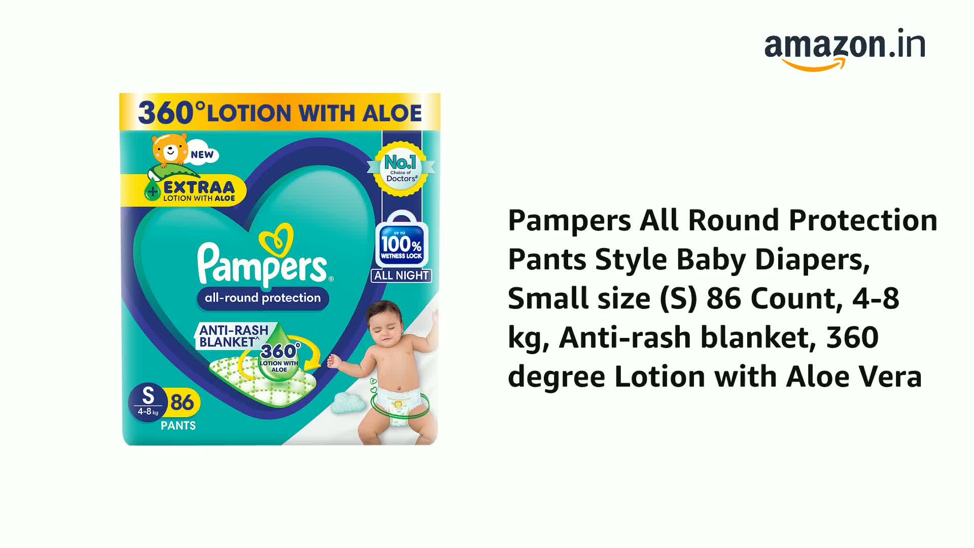 Pampers All Round Protection Pants Style Baby Diapers, Small size (S) 86 Count, 4-8 kg, Anti-rash blanket, 360 degree Lotion with Aloe Vera