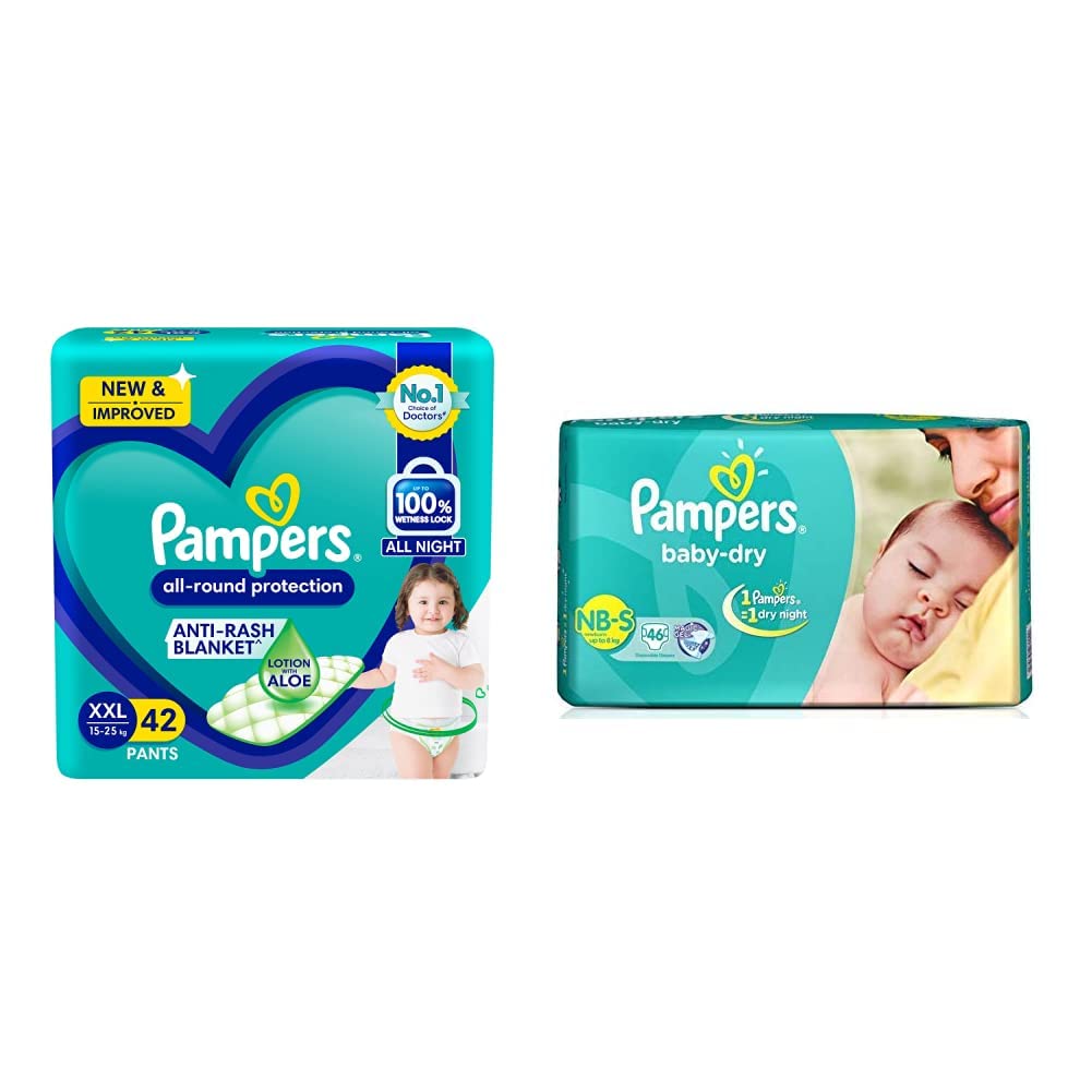 Pampers All round Protection Pants Double Extra Large size baby diapers (XXL) 42 Count Anti Rash diapers Lotion with Aloe VeraNEW & IMPROVED Pampers all-round protection pants have ANTI-RASH BLANKET* containing Lotion with Aloe Vera to keep your baby skin protected from redness irritation and rashes. quality diapers with 100% WETNESS LOCK keeps the pee locked inside & baby's bum stays dry for ALL NIGHT. Air channels & stretchy belt provides your baby breathable airy fit - comfortable even in summers. Pampers unique Magic gel technology provides up to 12 hours of dryness and has 2X faster absorption. The new and improved product design enables a comfortable fit closer to the baby body and an EXTRA SOFT flexible waist band that adapts to baby movements for best comfort. Available in all sizes Small diapers medium diaper pants large size diaper pants XL diapers XXL diapers XXXL diaper pants. A top layer with cotton-like soft material ensure a comfortable night sleep. Our pants with fun exterior graphics fun designs of characters and a delightful fresh Aloe fragrance ensures you enjoy every change with your baby. (*Blanket refers to soft topsheet with lotion. Helps prevent rash due to wetness after 1 day of usage based on clinical studies in USA 2000-2019).Pampers Taped Baby Diapers Small (SM) 46 countNEW & IMPROVED Pampers all-round protection pants have ANTI-RASH BLANKET* containing Lotion with Aloe Vera to keep your baby skin protected from redness irritation and rashes. quality diapers with 100% WETNESS LOCK keeps the pee locked inside & baby's bum stays dry for ALL NIGHT. Air channels & stretchy belt provides your baby breathable airy fit - comfortable even in summers. Pampers unique Magic gel technology provides up to 12 hours of dryness and has 2X faster absorption. The new and improved product design enables a comfortable fit closer to the baby body and an EXTRA SOFT flexible waist band that adapts to baby movements for best comfort. Available in all sizes Small diapers medium diaper pants large size diaper pants XL diapers XXL diapers XXXL diaper pants. A top layer with cotton-like soft material ensure a comfortable night sleep. Our pants with fun exterior graphics fun designs of characters and a delightful fresh Aloe fragrance ensures you enjoy every change with your baby. (*Blanket refers to soft topsheet with lotion. Helps prevent rash due to wetness after 1 day of usage based on clinical studies in USA 2000-2019).