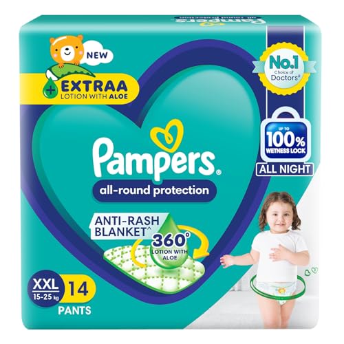 NEW IMPROVED Pampers all round protection pants have ANTI RASH BLANKET* containing Lotion with Aloe Vera to keep your baby skin protected from redness and rashes. Top quality diaper pants with Up to 100% WETNESS LOCK keeps the pee locked inside and baby's bum stays dry for ALL NIGHT. Air channels & stretchy belt provides your baby breathable airy fit comfortable even in summers. Pampers unique Magic gel technology provides up to 12 hours of dryness and has up to 2X faster absorption The new and improved design has an EXTRA SOFT material and a fit that adapts to baby movements for best comfort. Available in all sizes Small diapers medium diaper pants large size diaper pants XL diapers XXL diapers XXXL diaper pants. Our pants with fun exterior graphics fun designs of characters and a delightful fresh Aloe fragrance ensures you enjoy every change with your baby (*Blanket refers to soft topsheet with lotion Helps prevent rash due to wetness after 1 day of usage based on clinical studies in USA 2000 2019)