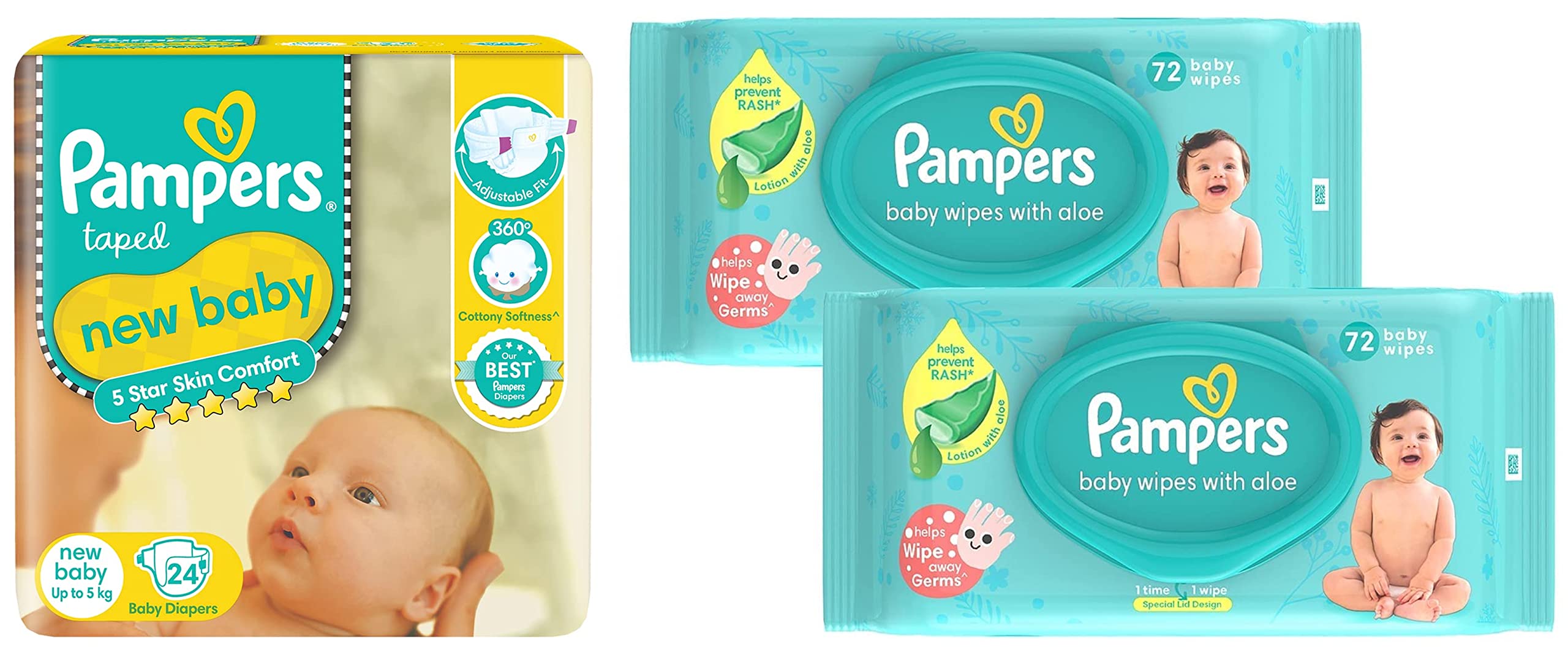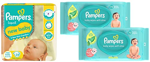 Pampers Active Baby Diapers New Born Extra Small (NB XS) size 24 Count Taped style diaper5 Star Skin Protection: The Best tape style diapers from Pampers with an outer layer of cotton-like softness this baby diaper provides intense care to your baby's sensitive skin and protects it effectively from friction rash and redness. These soft and comfort fitting diapers with stretchable sides are best for your baby's rest and playtime. The diaper's fastening tape sticks multiple times thus ensuring it stays in place even after you fasten it after checking your baby's diaper. Protection and nourishment of your baby's skin are taken care of with extracts of moisturizing Aloe Vera lotion characteristic of these best baby diapers.. These diapers are ultra-thin thanks to the absorbent gel material (AGM) commonly known as Magic Gel. This magic gel core of Pampers diapers is highly effective in absorbing frequent wetness. Naturally your baby's skin remains dry for upto 12 hours now no more frequent diaper changing or blow leaks for your little angel.Pampers Baby Gentle Wet Wipes with Aloe Vera 144 WipesEvery little miracle deserves gentle protection mothers & doctors have always trusted Pampers to provide the care. Presenting Pampers Baby Wipes with Aloe which have the goodness of lotion with Aloe vera to protect against skin rashes & redness. Containing 97% pure water Pampers Wipes provide mild cleaning for baby supples skin just like cotton & water. Pampers wipes are safe as they are paraben-free and infused with Vitamin-E. They help restore the natural pH of your baby skin keeping it healthy and nourished. Pampers wipes are thick soft and strong ensuring a perfect gentle cleaning for the baby skin.  Lastly the wipes come with a refreshing mild fragrance that you and your baby will surely love. Wet wipes tissues with lid 72 pcs combo pack.
