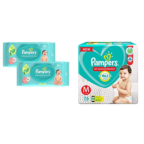 Pampers All round Protection Pants Medium size baby diapers (M) 76 Count Lotion with Aloe VeraNEW & IMPROVED Pampers all-round protection pants have ANTI-RASH BLANKET* containing Lotion with Aloe Vera to keep your baby’s skin protected from redness irritation and rashes. Best quality diapers with 100% WETNESS LOCK keeps the pee locked inside & baby's bum stays dry for ALL NIGHT. Air channels & stretchy belt provides your baby breathable airy fit - comfortable even in summers. Pampers unique Magic gel technology provides up to 12 hours of dryness – and has 2X faster absorption. The new and improved product design enables a comfortable fit closer to the baby’s body and an EXTRA SOFT flexible waist band that adapts to baby’s movements for best comfort. Available in all sizes – Small diapers medium diaper pants large size diaper pants XL diapers XXL diapers XXXL diaper pants. A top layer with cotton-like soft material ensure a comfortable night’s sleep. Our pants with fun exterior graphics fun designs of characters and a delightful fresh Aloe fragrance ensures you enjoy every change with your baby. (*Blanket refers to soft topsheet with lotion. Helps prevent rash due to wetness after 1 day of usage based on clinical studies in USA 2000-2019).Pampers Baby Gentle Wet Wipes with Aloe Vera 144 WipesEvery little miracle deserves gentle protection – mothers & doctors have always trusted Pampers to provide the care. Presenting Pampers Baby Wipes with Aloe which have the goodness of lotion with Aloe vera to protect against skin rashes & redness. Containing 97% pure water Pampers Wipes provide mild cleaning for baby’s supples skin just like cotton & water. Pampers wipes are safe as they are paraben-free and infused with Vitamin-E. They help restore the natural pH of your baby’s skin keeping it healthy and nourished. Pampers wipes are thick soft and strong ensuring a perfect gentle cleaning for the baby’s skin.  Lastly the wipes come with a refreshing mild fragrance that you and your baby will surely love. Wet wipes tissues with lid 72 pcs combo pack.