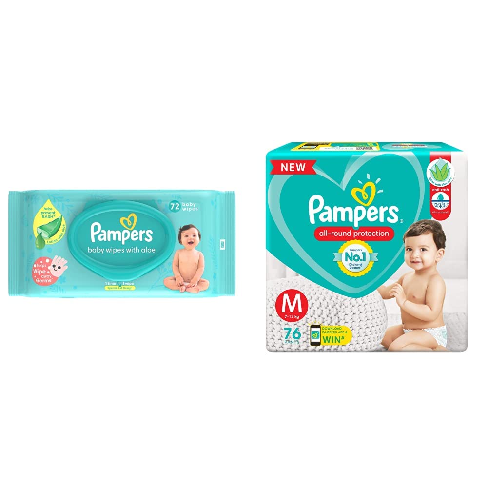 Pampers All round Protection Pants Medium size baby diapers (M) 76 Count Lotion with Aloe VeraNEW & IMPROVED Pampers all-round protection pants have ANTI-RASH BLANKET* containing Lotion with Aloe Vera to keep your baby skin protected from redness irritation and rashes. Best quality diapers with 100% WETNESS LOCK keeps the pee locked inside & baby's bum stays dry for ALL NIGHT. Air channels & stretchy belt provides your baby breathable airy fit - comfortable even in summers. Pampers unique Magic gel technology provides up to 12 hours of dryness and has 2X faster absorption. The new and improved product design enables a comfortable fit closer to the baby body and an EXTRA SOFT flexible waist band that adapts to baby movements for best comfort. Available in all sizes Small diapers medium diaper pants large size diaper pants XL diapers XXL diapers XXXL diaper pants. A top layer with cotton-like soft material ensure a comfortable night sleep. Our pants with fun exterior graphics fun designs of characters and a delightful fresh Aloe fragrance ensures you enjoy every change with your baby. (*Blanket refers to soft topsheet with lotion. Helps prevent rash due to wetness after 1 day of usage based on clinical studies in USA 2000-2019).Pampers Baby Aloe Wipes with Lid 72 WipesEvery little miracle deserves gentle protection mothers & doctors have always trusted Pampers to provide the care. Presenting Pampers Baby Wipes with Aloe which have the goodness of lotion with Aloe vera to protect against skin rashes & redness. Containing 97% pure water Pampers Wipes provide mild cleaning for baby supples skin just like cotton & water. Pampers wipes are safe as they are paraben-free and infused with Vitamin-E. They help restore the natural pH of your baby skin keeping it healthy and nourished. Pampers wipes are thick soft and strong ensuring a perfect gentle cleaning for the baby skin. Lastly the wipes come with a refreshing mild fragrance that you and your baby will surely love. Wet wipes tissues with lid 72 pcs combo pack.