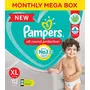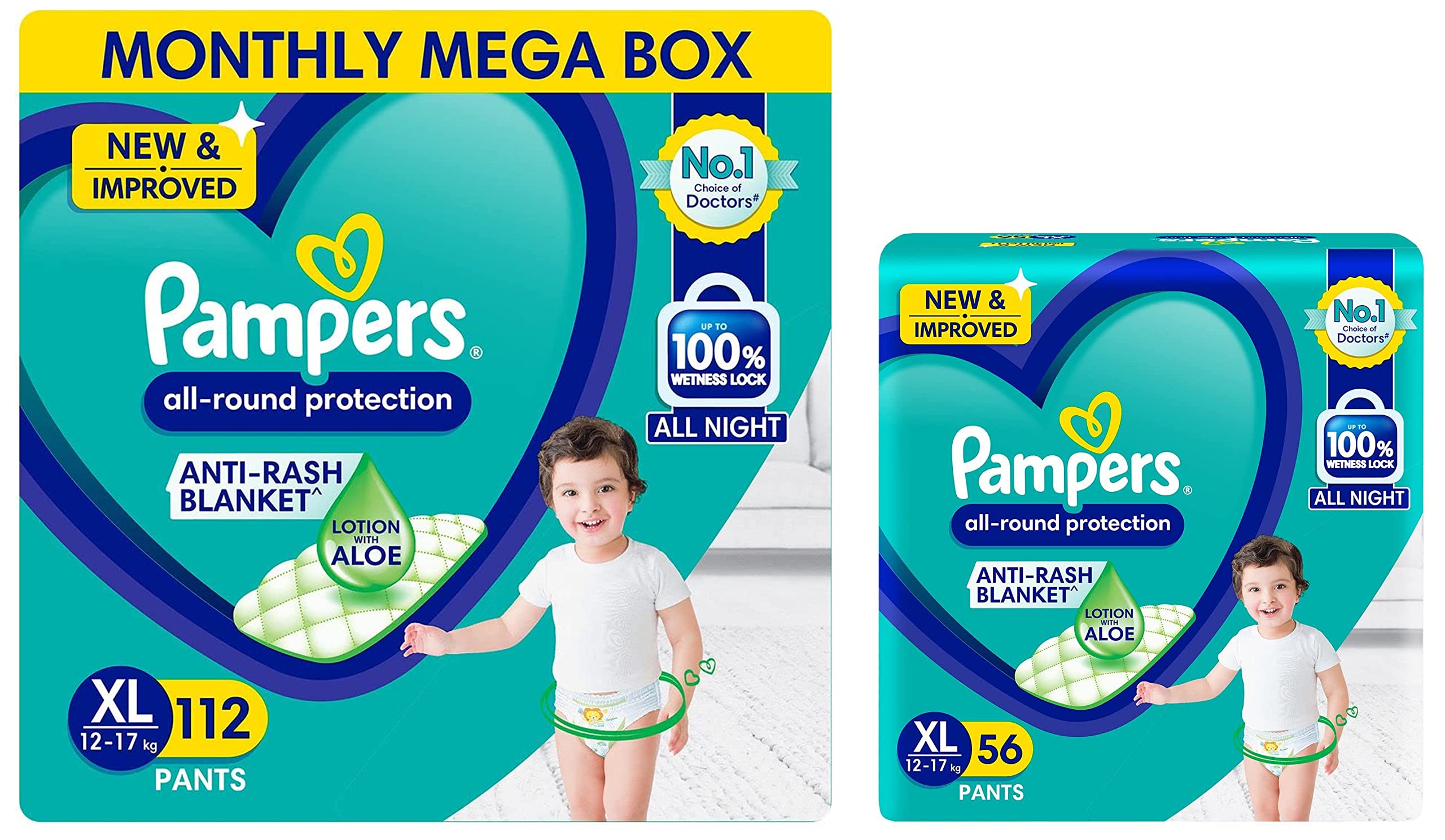 Pampers New Diapers Pants Monthly Box Packs X-Large (112 Count)Pampers Baby-Dry pants style diapers are the only pants in India with Ultra Absorb Core Double Leak Guards and Lotion with Aloe Vera. Ultra Absorb Core provides your baby a new type of dryness overnight - breathable dryness. Magic gel locks wetness away to provide up to 12 hours of dryness. Now infused with baby lotion that has Aloe Vera helps protect your baby’s delicate skin from diaper rash and irritation. The new and improved product design enables a comfortable fit closer to the baby’s body and a flexible waist band that adapts to baby’s movements for a comfortable fit. A top layer with cotton-like soft material ensure a comfortable night’s sleep. Our pants with fun exterior graphics fun designs and characters ensure you enjoy with your baby.Pampers New Diapers Pants XL (56 Count)Pampers Baby-Dry pants style diapers are the only pants in India with Ultra Absorb Core Double Leak Guards and Lotion with Aloe Vera. Ultra Absorb Core provides your baby a new type of dryness overnight - breathable dryness. Magic gel locks wetness away to provide up to 12 hours of dryness. Now infused with baby lotion that has Aloe Vera helps protect your baby’s delicate skin from diaper rash and irritation. The new and improved product design enables a comfortable fit closer to the baby’s body and a flexible waist band that adapts to baby’s movements for a comfortable fit. A top layer with cotton-like soft material ensure a comfortable night’s sleep. Our pants with fun exterior graphics fun designs and characters ensure you enjoy with your baby.