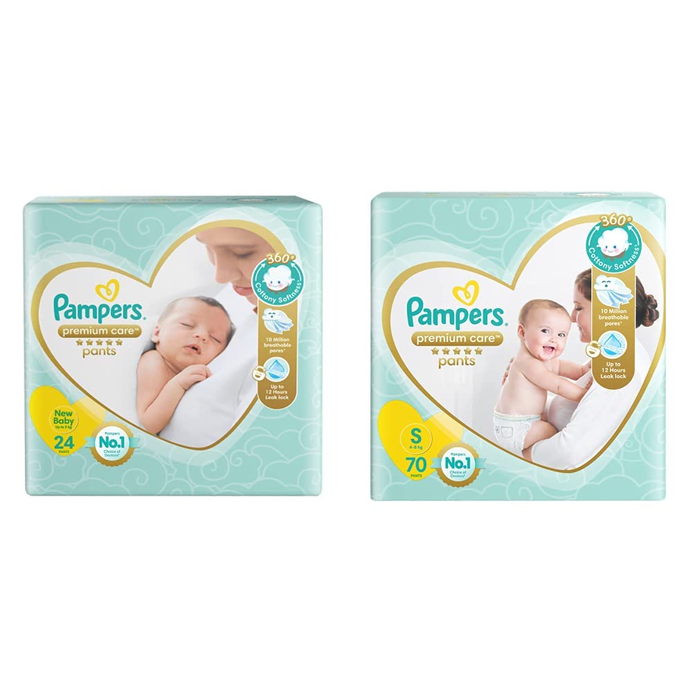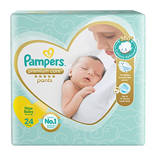 Pampers Premium Care Pants Diapers Extra Small (XS) NB 24 CountNew Pampers premium pants with cotton like soft materials is best for your baby delicate skin. Pampers premium pants contain lotion with aloe vera and 3 air channels which helps your baby skin breathe. Experience 5 star comfort with unique added features like wetness indicator which turns yellow to blue indication when you may change and disposal tape which helps you in easy disposal of the diaper. Pampers is the no.1 choice of doctors for diapers. Pampers premium pants are available in new born (nb) s m l xl and xxl sizes.Pampers Premium Care Pants Diapers Small S 70 CountNew Pampers premium pants with cotton like soft materials is best for your baby delicate skin. Pampers premium pants contain lotion with aloe vera and 3 air channels which helps your baby skin breathe. Experience 5 star comfort with unique added features like wetness indicator which turns yellow to blue indication when you may change and disposal tape which helps you in easy disposal of the diaper. Pampers is the no.1 choice of doctors for diapers. Pampers premium pants are available in new born (nb) s m l xl and xxl sizes.