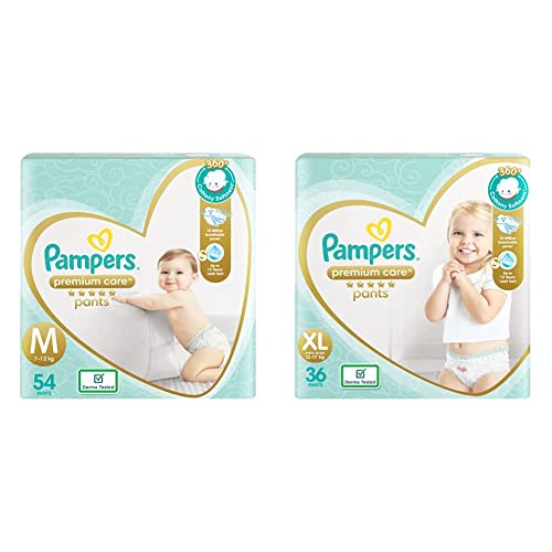 Pampers Premium Care Pants Diapers Medium 54 CountNew pampers premium pants with cotton like soft materials is best for your baby delicate skin. Pampers premium pants contain lotion with aloe vera and 3 air channels which helps your baby skin breathe. Experience 5 star comfort with unique added features like wetness indicator which turns yellow to blue indication when you may change and disposal tape which helps you in easy disposal of the diaper. Pampers is the no. 1 Choice of doctors for diapers. Pampers premium pants are available in new-born (nb) s m l xl and xxl sizes.Pampers Premium Care Pants Diapers XL 36 CountNew Pampers Premium Pants with cotton like soft materials is best for your baby delicate skin. Pampers Premium Pants contain lotion with Aloe Vera and 3 Air Channels which helps your baby skin breathe. Experience 5 Star comfort with unique added features like Wetness Indicator which turns Yellow to Blue indication when you may change and Disposal Tape which helps you in easy disposal of the diaper. Pampers Premium Pants are available in New-born (NB) S M L XL and XXL sizes.